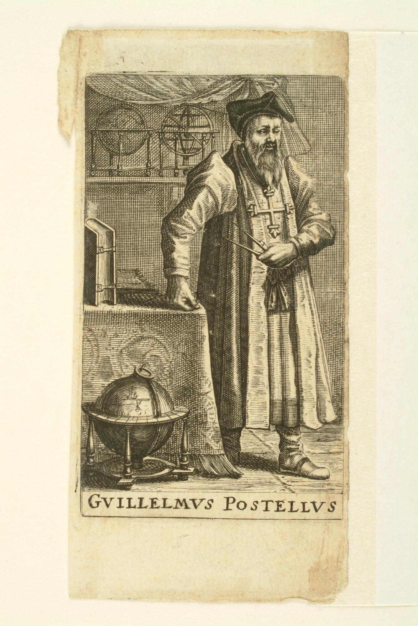 Portret van Wilhelm Postel, staande aan een tafel, op de grond een globe.