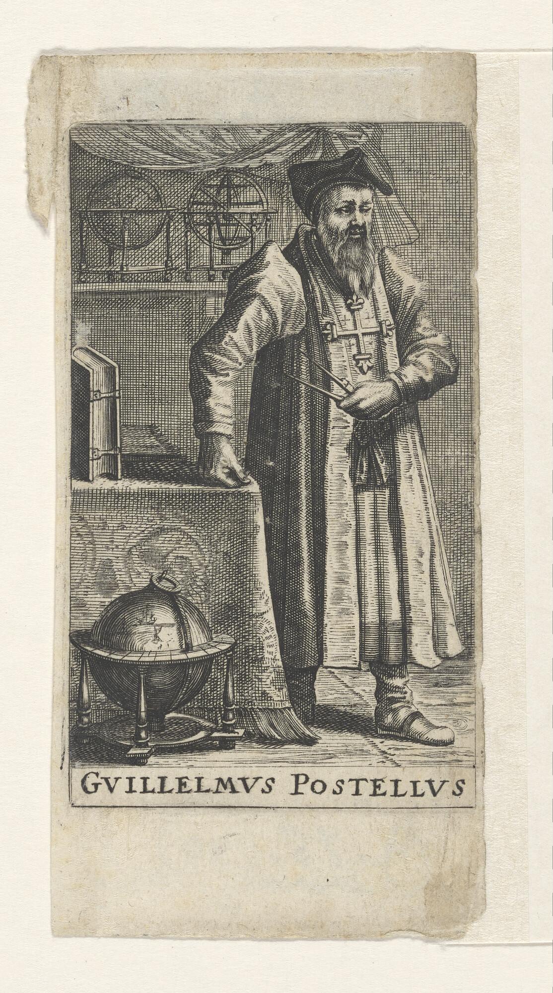 Portret van Wilhelm Postel, staande aan een tafel, op de grond een globe