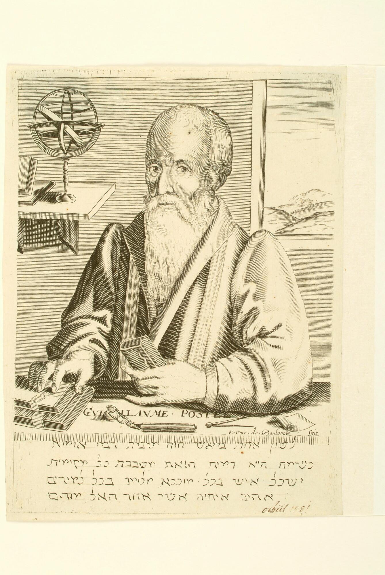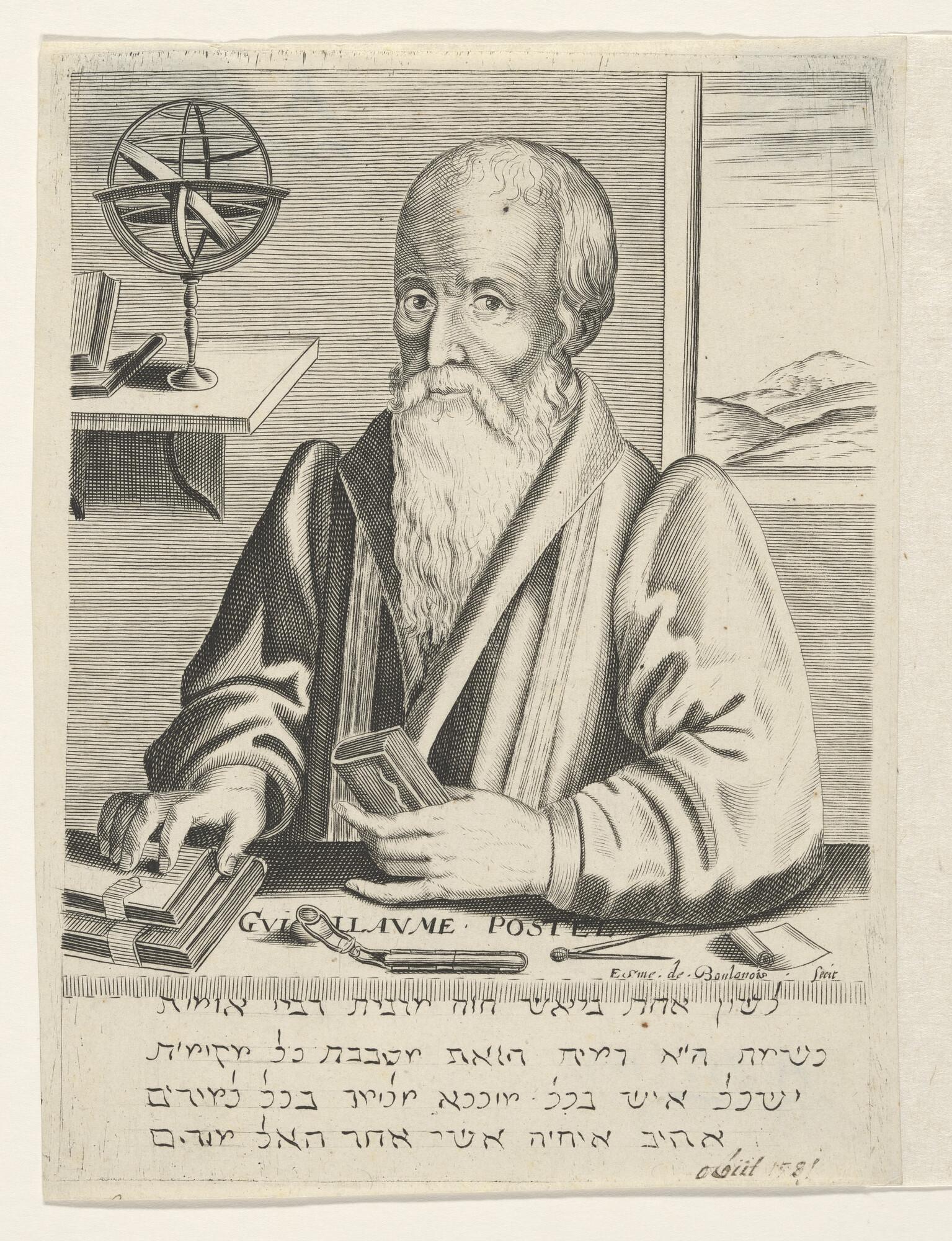 Portret van Wilhelm Postel, zittende aan een tafel met boek in de hand. Op de tafel ligt onder andere een passer.