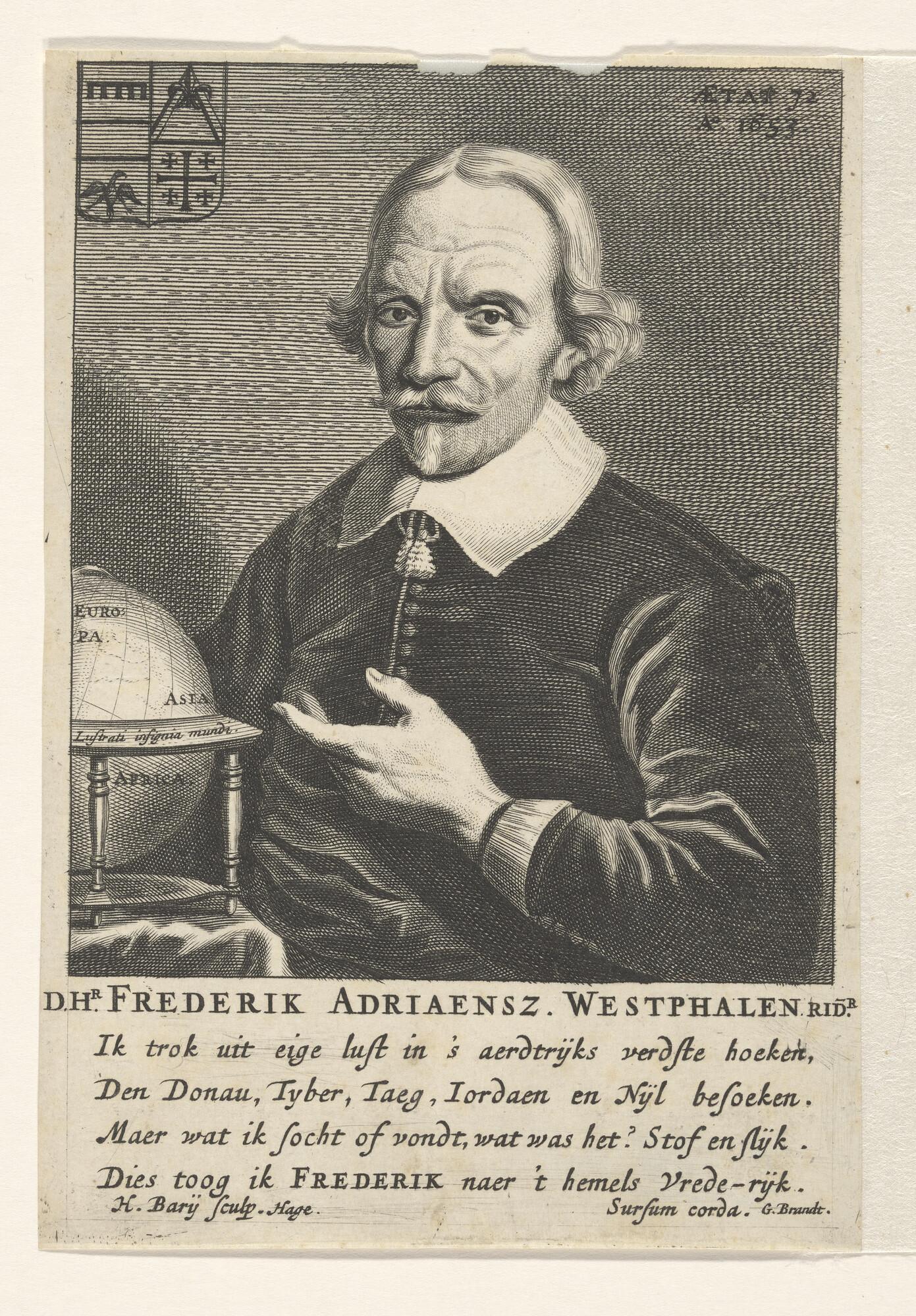 Portret van ridder, reiziger en oudheidkundige Frederik Adriaansz Westfalen. Met een vierregelig vers door G. Brandt.