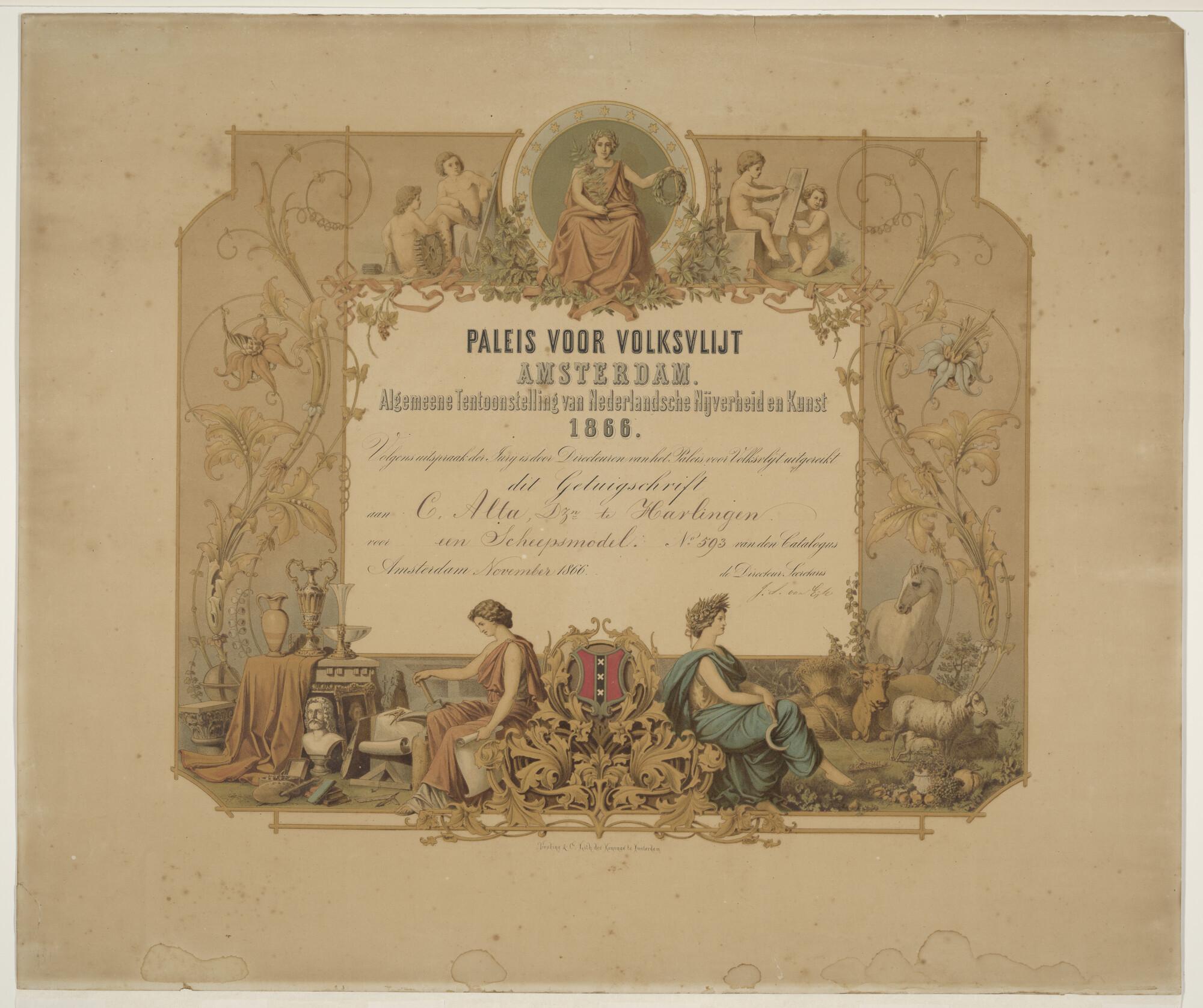 Diploma uitgereikt in 1866 aan C. Alta voor een scheepsmodel
