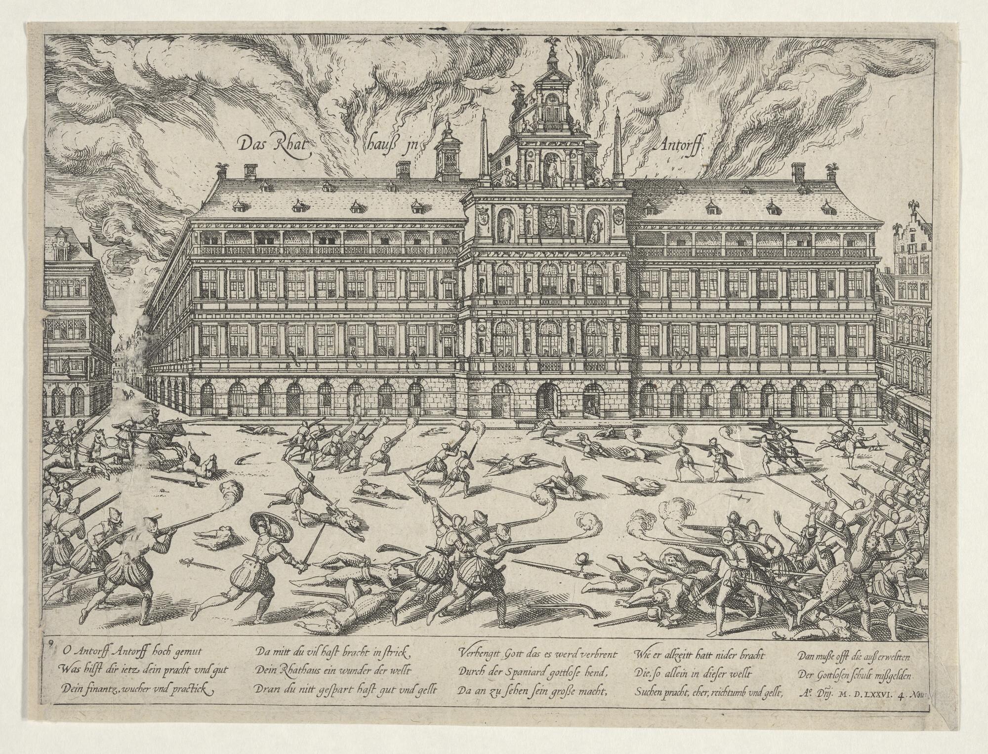 Spaanse Furie te Antwerpen, 4 november 1576. Op de Markt bij het Stadhuis.