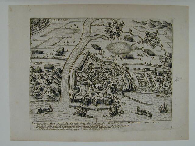Kaart van Oostende en omgeving, tijdens de belegering door Albertus van Oostenrijk, 1601