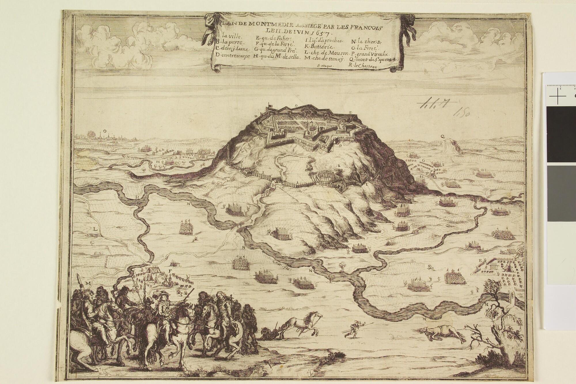Plattegrond van de Franse stad Montmedie aan de rivier de Cher en omgeving, tijdens de belegering door de Fransen, 2 juni 1657.