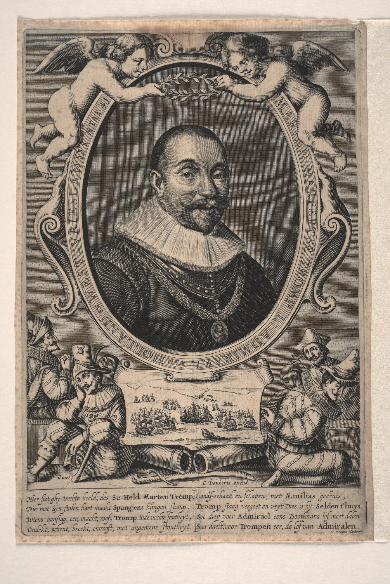 Portret van Marten Harpertsz. Tromp, 41 jaar oud. Onder het portret een afbeelding van een zeeslag met 6 gevangen Spanjaarden er omheen, en daaronder een gedicht van 8 regels door H. Bergius.