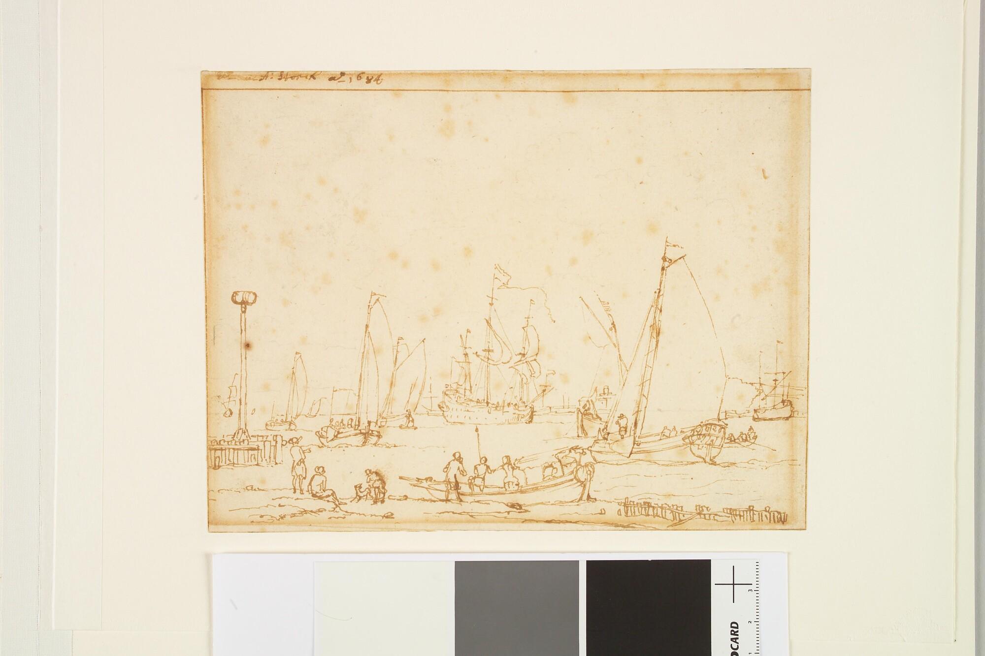 Riviergezicht met op de voorgrond een staatsiesloep en rechts een bezaanjacht. Op de achtergrond in het midden een driemaster.
