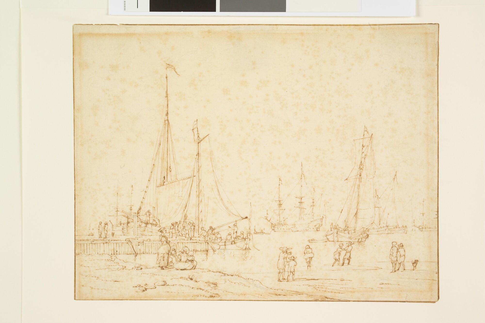 Een havengezicht met meerdere schepen.