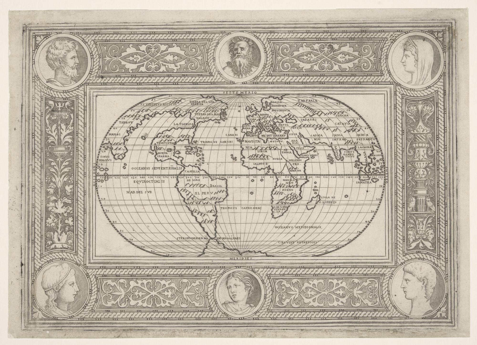 Wereldkaart door Giorgio Callapoda (werkzaam 1537-1565) met zes portretten van drie mannen en drie vrouwen in een brede decoratieve rand. De kaart is waarschijnlijk uitgegeven in Venetie, circa 1555.