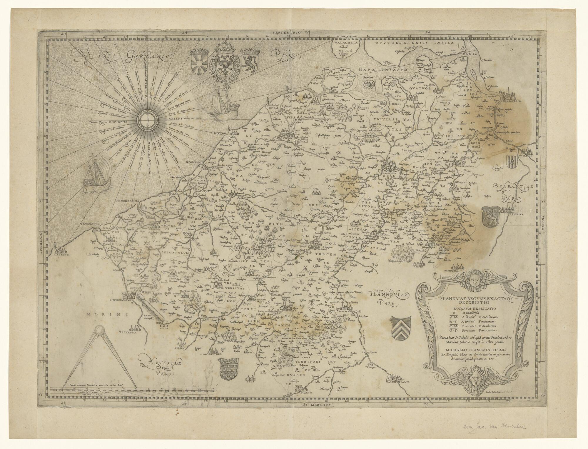 Kaart van Vlaanderen gegraveerd door Jacobus Bussius Belga (Jacob Bos, fl.1551-1577), uitgave Michaelo Tramezini (15 -1562), Venetië, 1555. Door Bagrow is deze kaart toegeschreven aan Jacob van Deventer (1500-1575) (schaal 1 op 900.000).