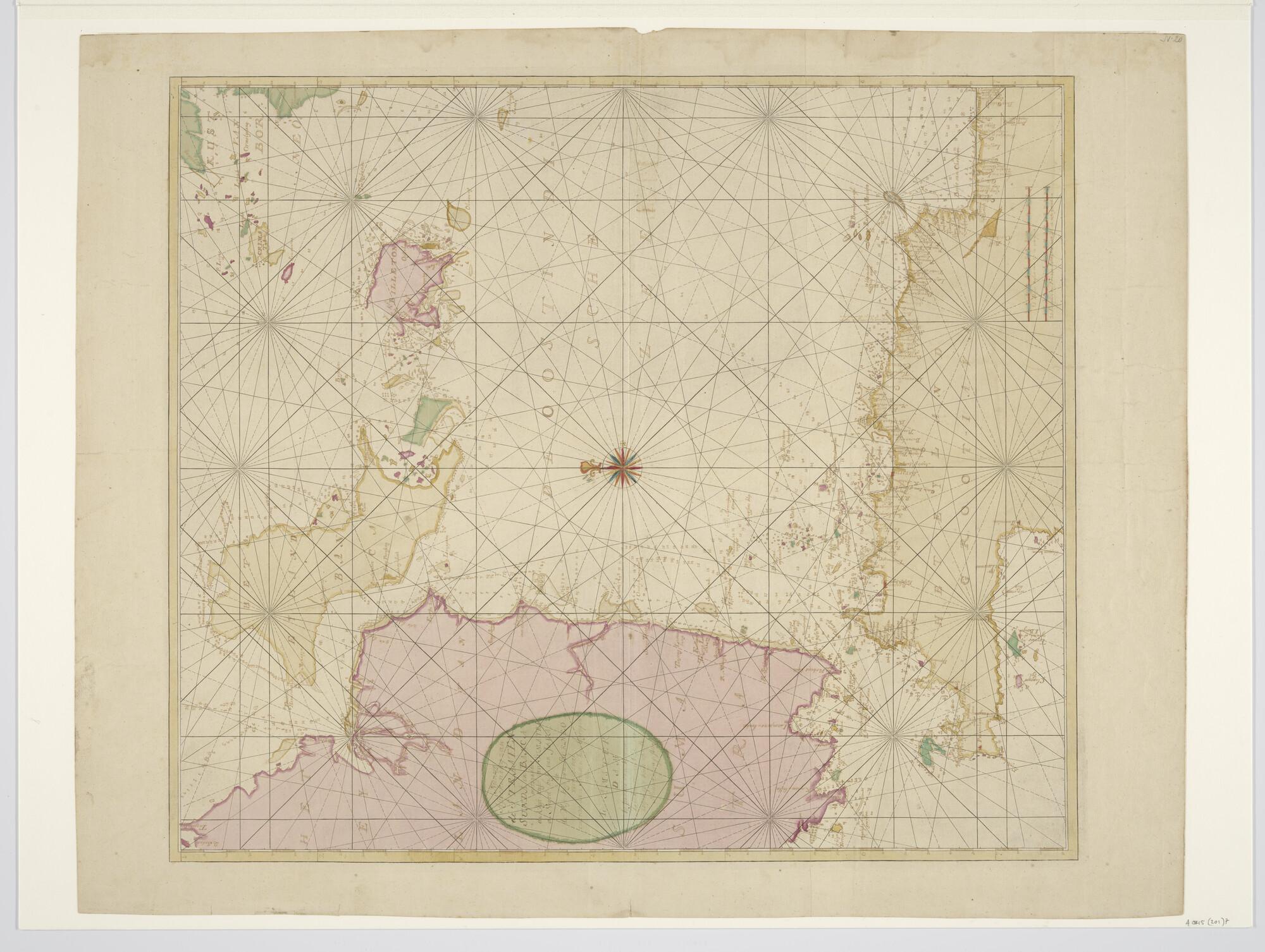 Gekleurde handschriftkaart van Straat Sunda en Straat Banka, de eilanden Banca en Billiton en een gedeelte van de eilanden Sumatra, Java en Borneo. Uitgave Johannes van Keulen, Amsterdam, circa 1750. Schaal 1 op 1.300.000.