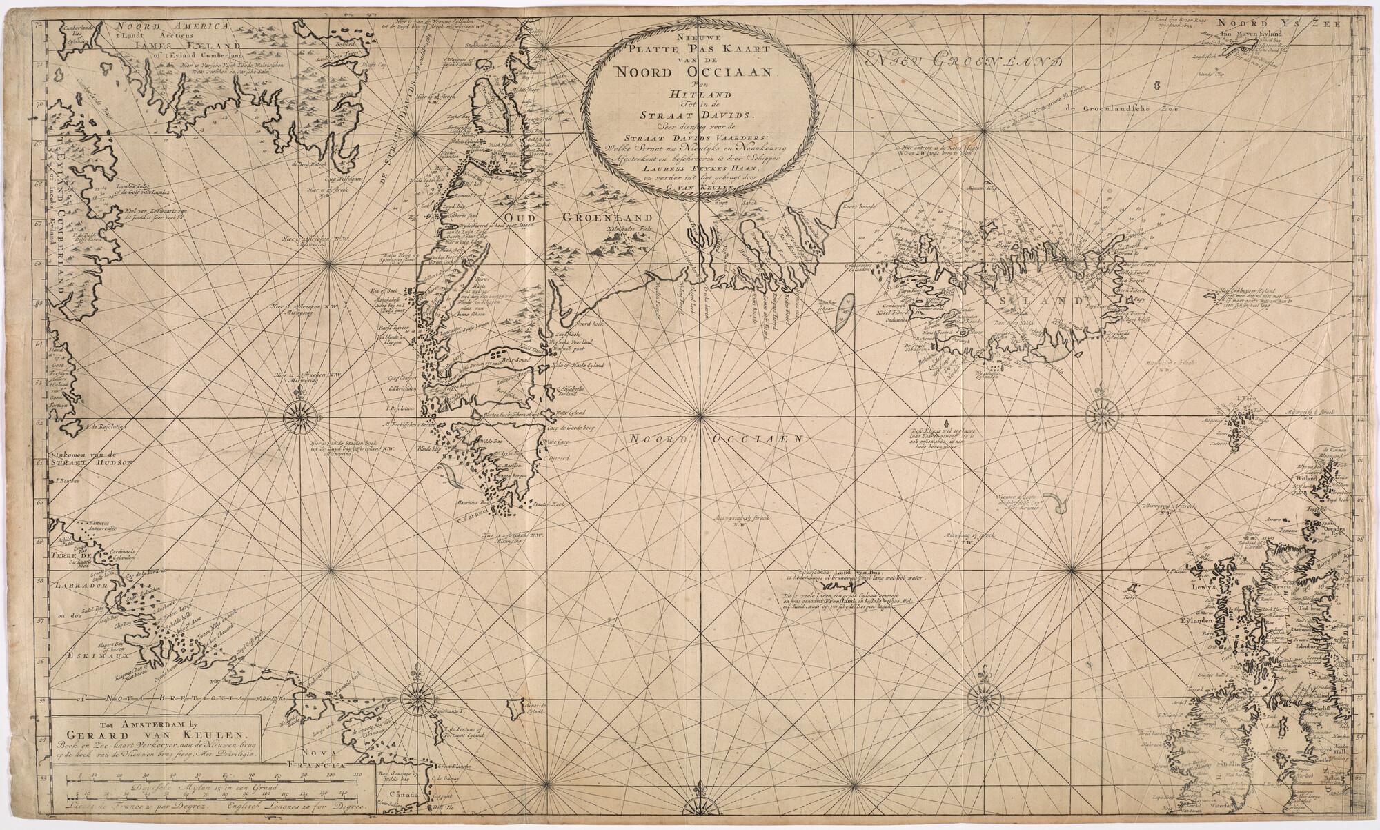 Kaart van de Noord Atlantische Oceaan tussen 53° en 72° breedte, door Laurens Feykes Haan. Uitgave Gerard van Keulen (1678-1727), Amsterdam, circa 1714.