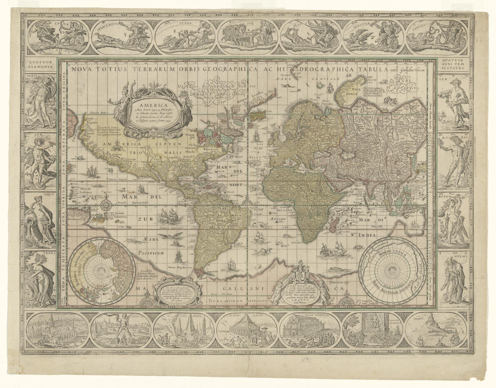 Met de hand gekleurde wereldkaart gegraveerd door Josua van den Ende (circa 1584 - 1634). Uitgave Willem Jansz. Blaeu, Appendix, 1630, of atlassen. Met randafbeeldingen der jaargetijden, elementen, enz. Mercator projectie (schaal 1 op 100.000.000).