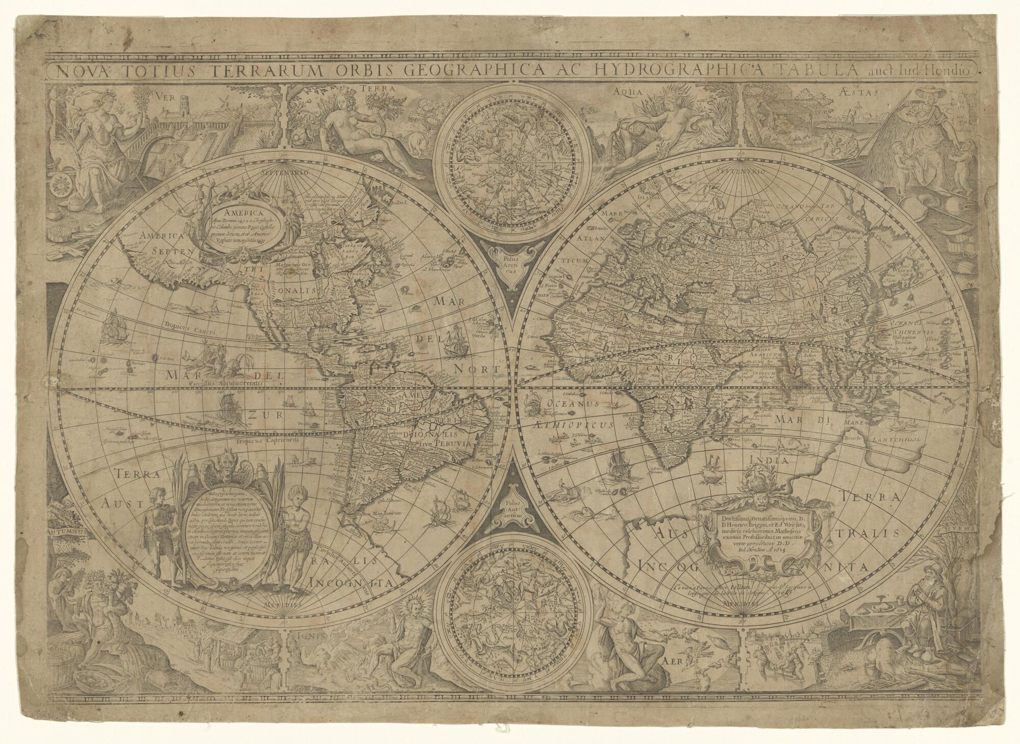 Wereldkaart in twee halfronden door Jodocus Hondius, oorspronkelijk uitgegeven Amsterdam, 1617. Heruitgave Jollian, Parijs 1655. In de hoeken beelden van de vier jaargetijden en de vier elementen. Verwijzing naar Briggs & Wright.