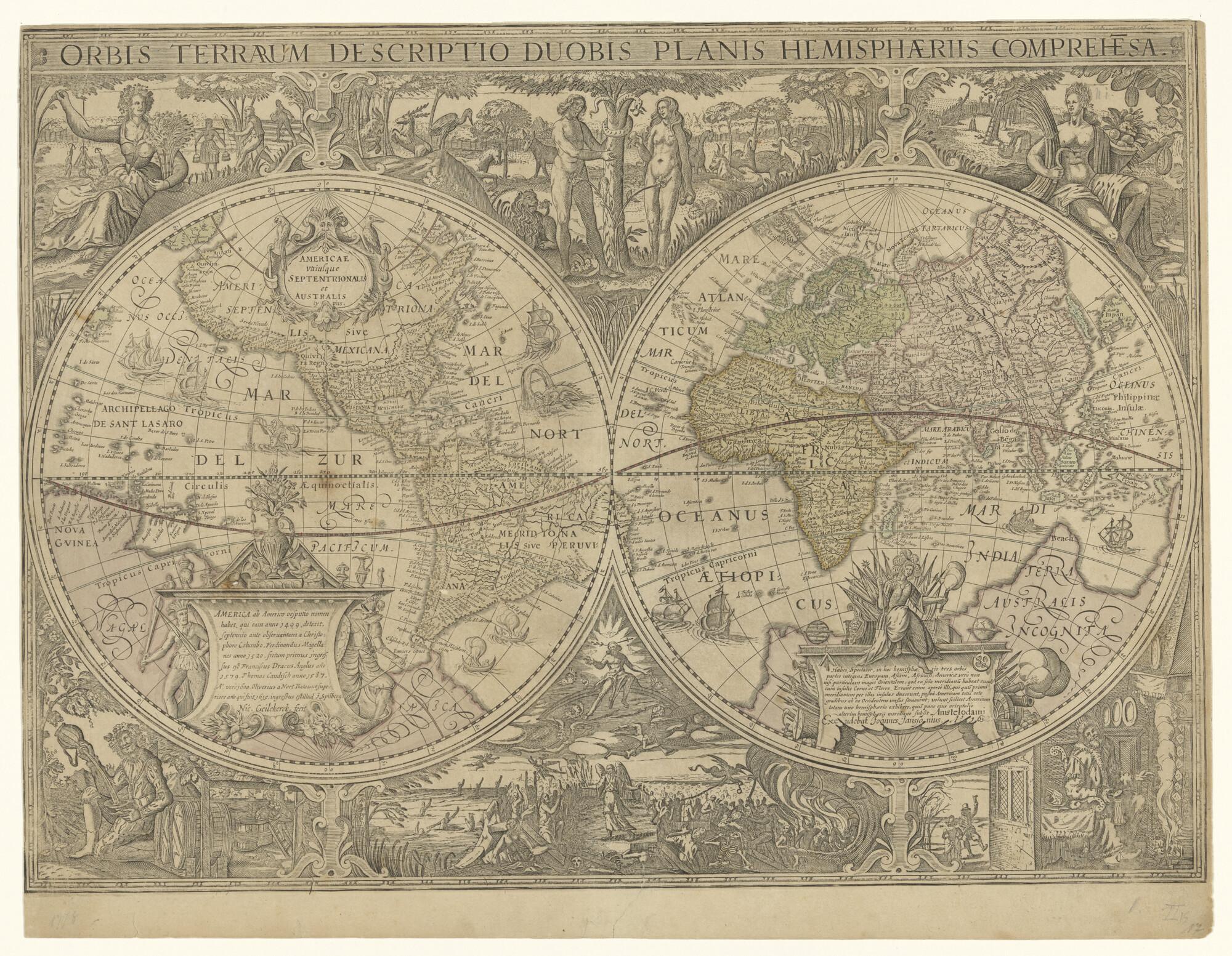 Met de hand gekleurde wereldkaart in twee halfronden van Nicolaas van Geelkerken (+ 1657?) (oorspronkelijke uitgave 1617). Heruitgave (2e staat) Johannes Janssonius (1588 - 1664), Amsterdam, 1632. Lengte volgens Corvo. Zeldzaam.