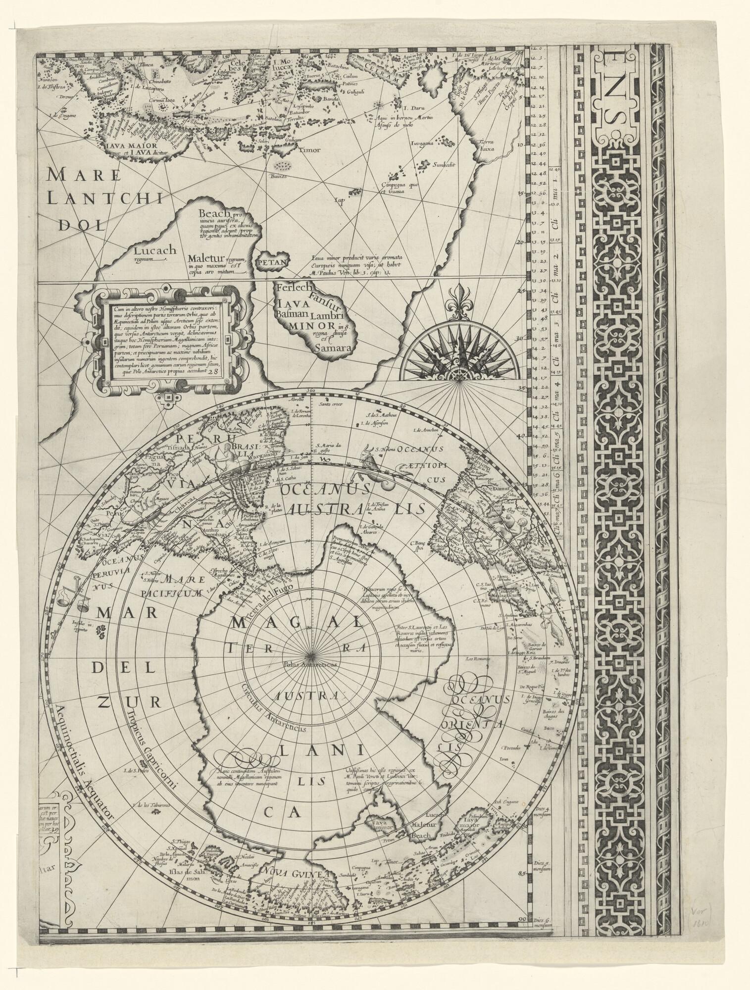 Eén blad van tweede druk van wereldkaart in twaalf bladen van Petrus Plancius, uit ca. 1604, met in poolprojectie het zuidelijke halfrond en een gedeelte van de het kaartbeeld van de wereldkaart, met Java en deel van Sumatra. Gravure Josua van den Ende, wellicht uitgave Willem Jansz Blaeu, Amsterdam, circa 1604 (schaal 1 op 20.000.000).