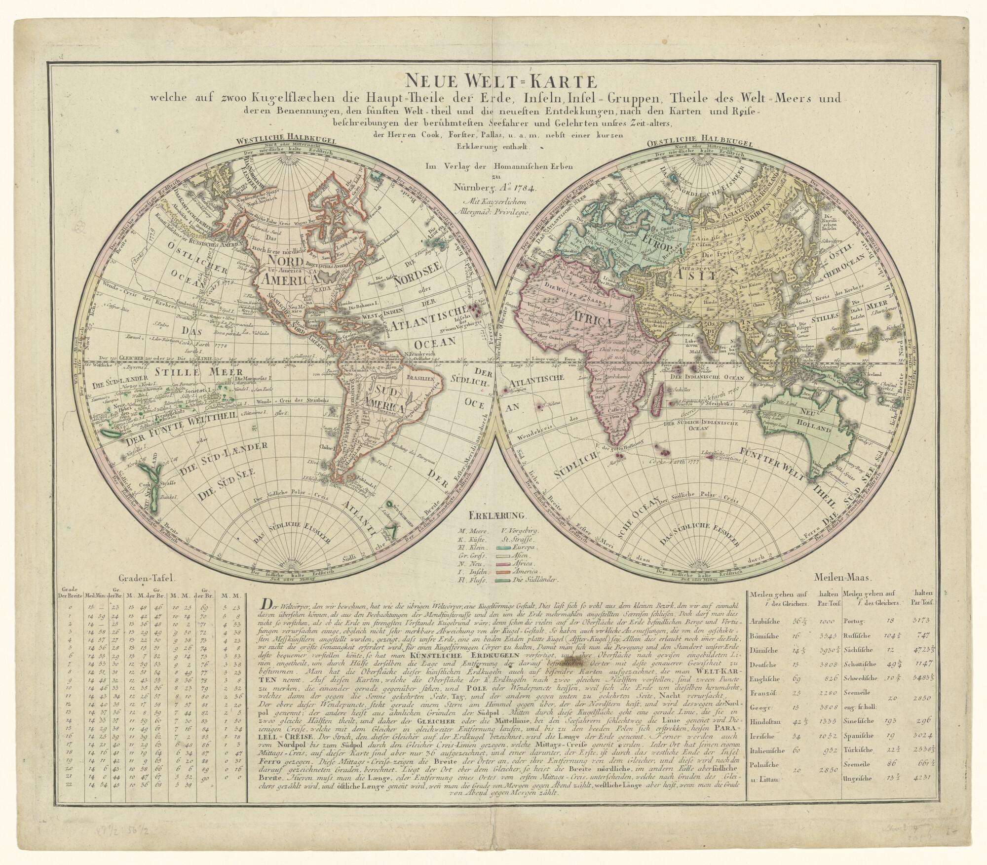 Met de hand gekleurde wereldkaart met de ontdekkingen van James Cook, Johann George Forster (1754 - 1794), Peter Simon Pallas (1741 - 1811), enz. Uitgave Erven Homann, Neurenberg, 1784. Lengte volgens Ferro.