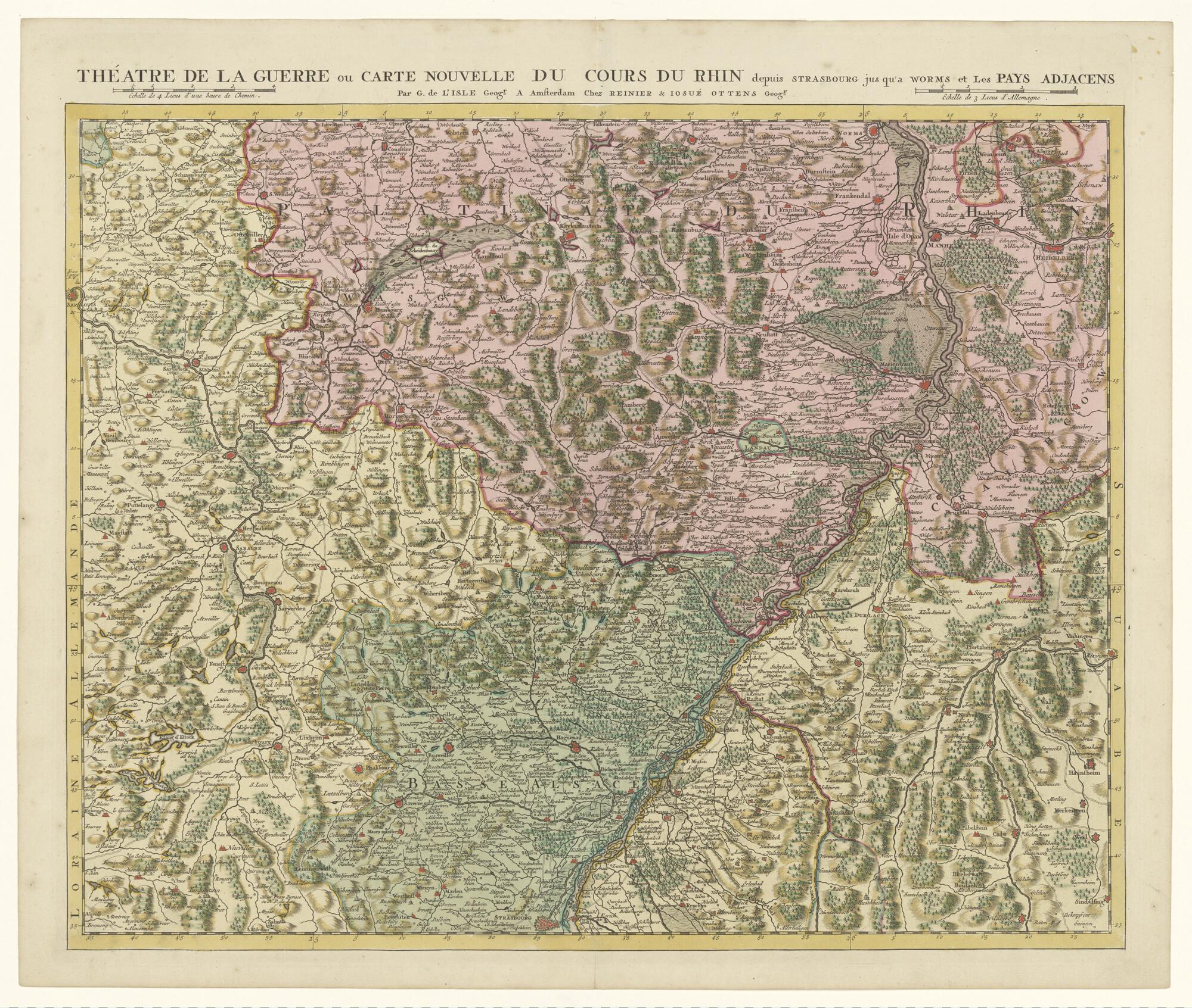 Met de hand gekleurde kaart naar G. de l'Isle (1675-1726) van de Rijn van Straatsburg tot Worms en de omringende landen. Uitgave Reinier & Josua Ottens, Amsterdam, circa 1730. Lengte t.o.v. de meridiaan van Teneriffe (schaal 1 op 250.000).