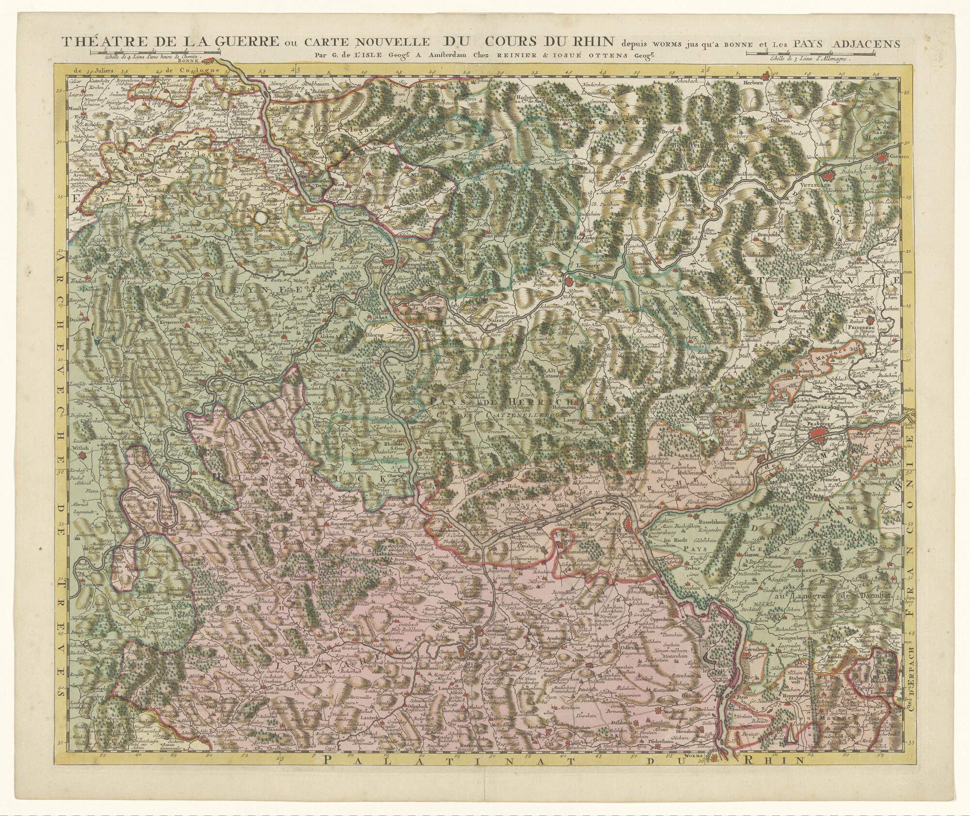 Met de hand gekleurde kaart naar G. de l'Isle (1675-1726) van de Rijn van Worms tot Bonn en de omringende landen. Uitgave Reinier & Josua Ottens, Amsterdam, circa 1730. Lengte t.o.v. de meridiaan van Teneriffe (schaal 1 op 250.000).