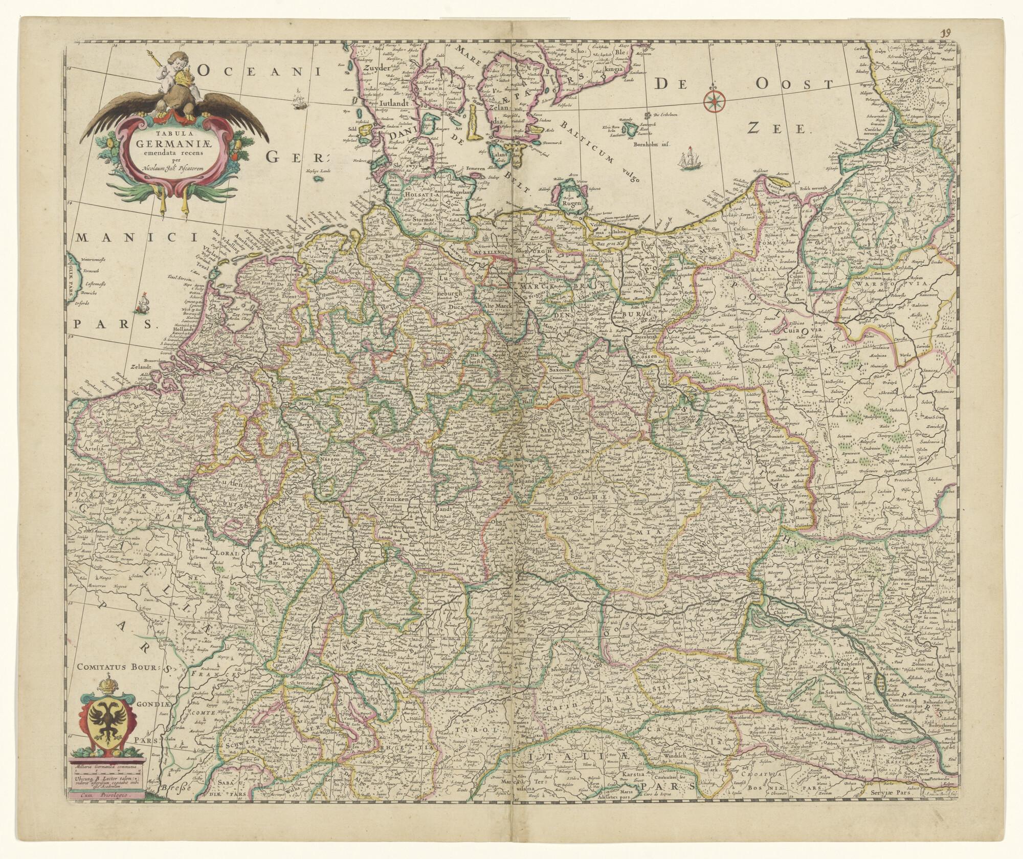 Met de hand gekleurde kaart van Duitsland. Uitgave Nicolaas Jansz Visscher (1649-1702), Amsterdam, circa 1690. Lengte t.o.v. de meridiaan van Flores ?. Op Mercator projectie (schaal 1 op 2.700.000).