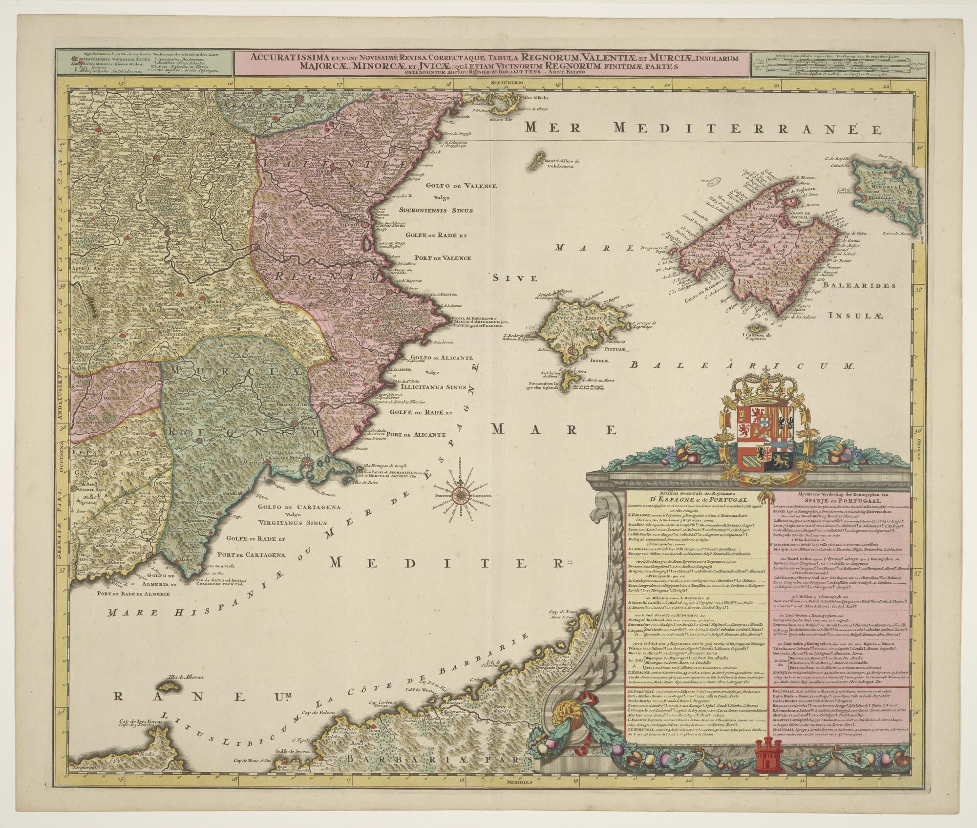 Met de hand gekleurde kaart van het noordoostelijk deel van Spanje. Uitgave Reinier en Joshua Ottens (1725-1750), Amsterdam, circa 1730. Lengte t.o.v. de meridiaan van Teneriffe (schaal 1 op 1.150.000).