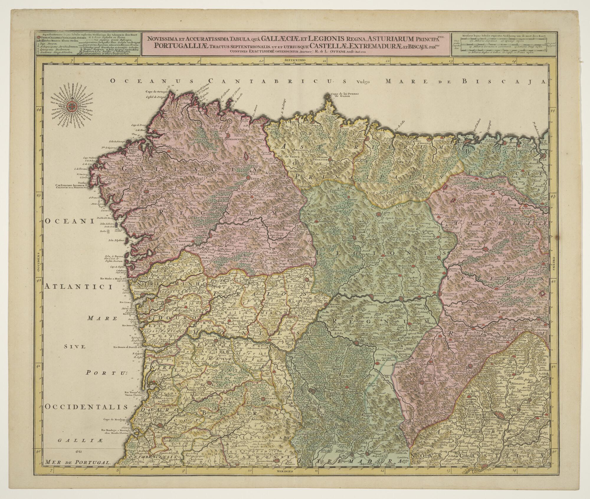 Met de hand gekleurde kaart van het noordwesteljke deel van Spanje en Noord-Portugal. Uitgave Reinier & Joshua Ottens (1725 - 1750), Amsterdam, circa 1730. Lengte t.o.v. de meridiaan van Teneriffe (schaal 1 op 1.150.000).