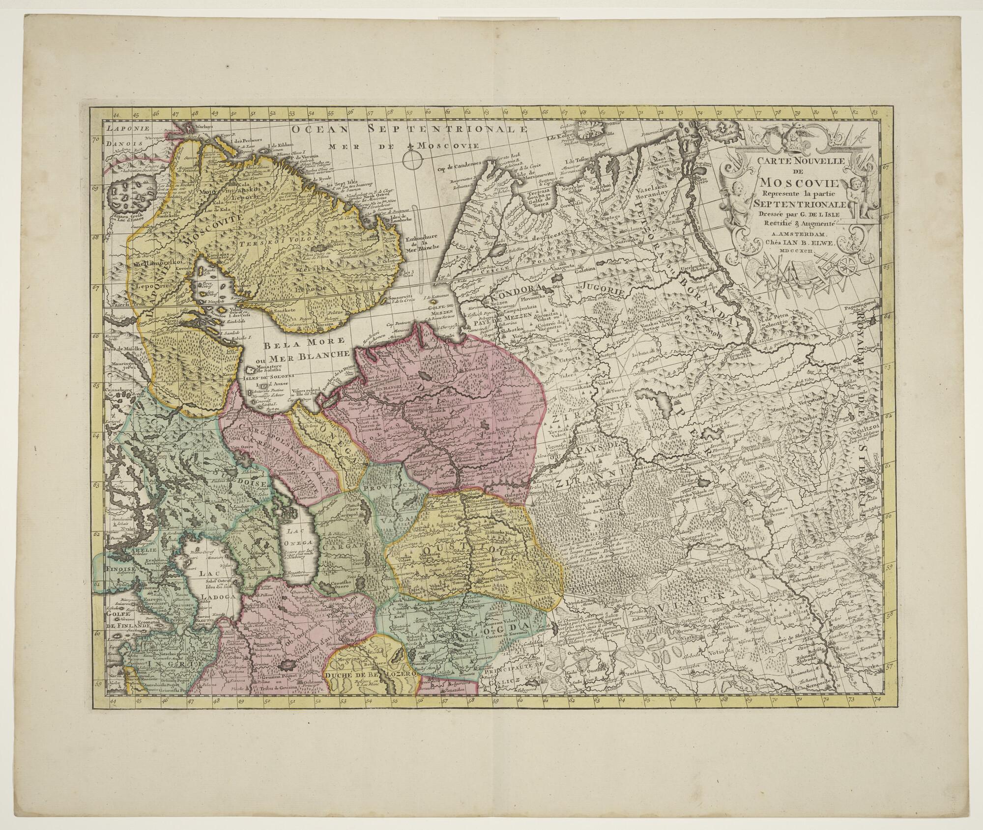 Met de hand gekleurde kaart naar Guillaume De l'Isle (1675 - 1726), van Moscovië. Uitgave Jan Barend Elwe, Amsterdam, 1792. Lengte t.o.v. de meridiaan van de Canarische Eilanden ? (schaal 1 op 3.200.000).