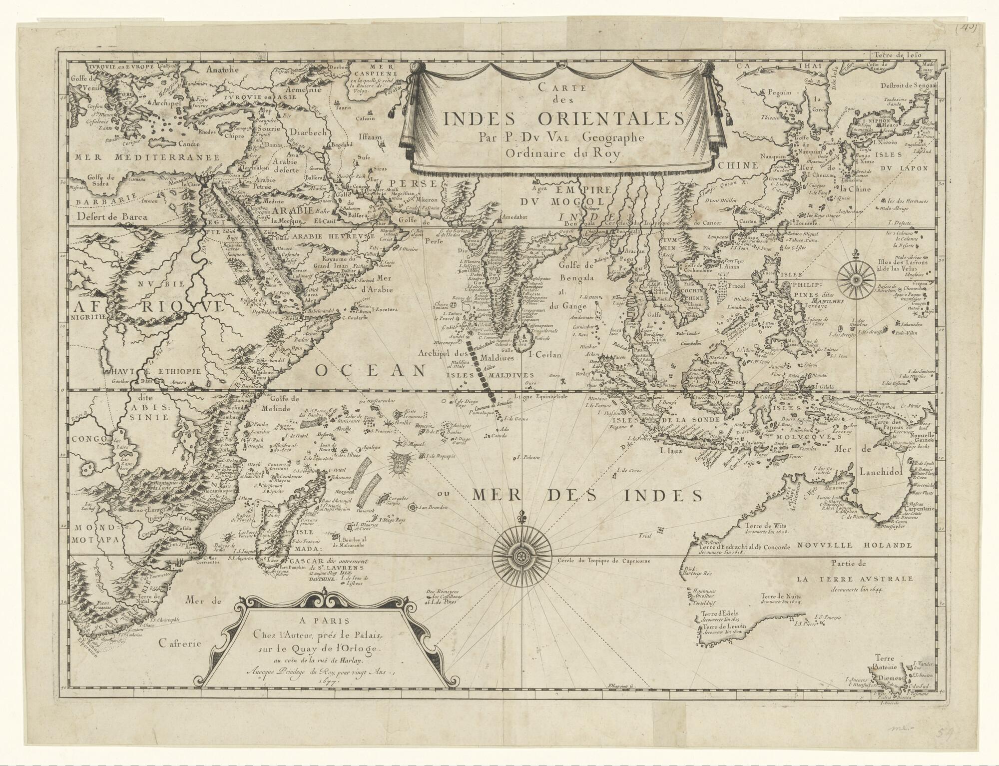 Kaart van de Indische Oceaan en omringende continenten, uitgegeven door Pierre Du Val d' Abbéville (1618-1683), Parijs, 1677 (schaal 1 op 25.000.000).