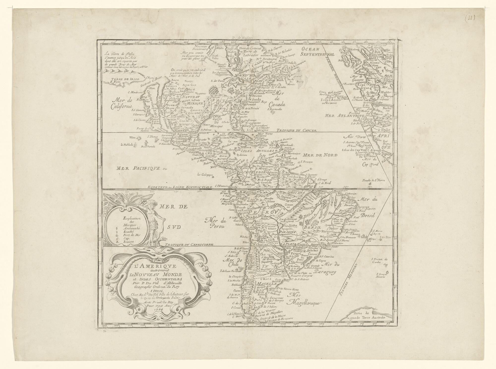 Kaart van Amerika. Uitgave Pierre Du Val d' Abbéville (1618-1683), Parijs, 1684, aldaar te koop bij diens dochter. Tiende staat (schaal 1 op 40.000.000).