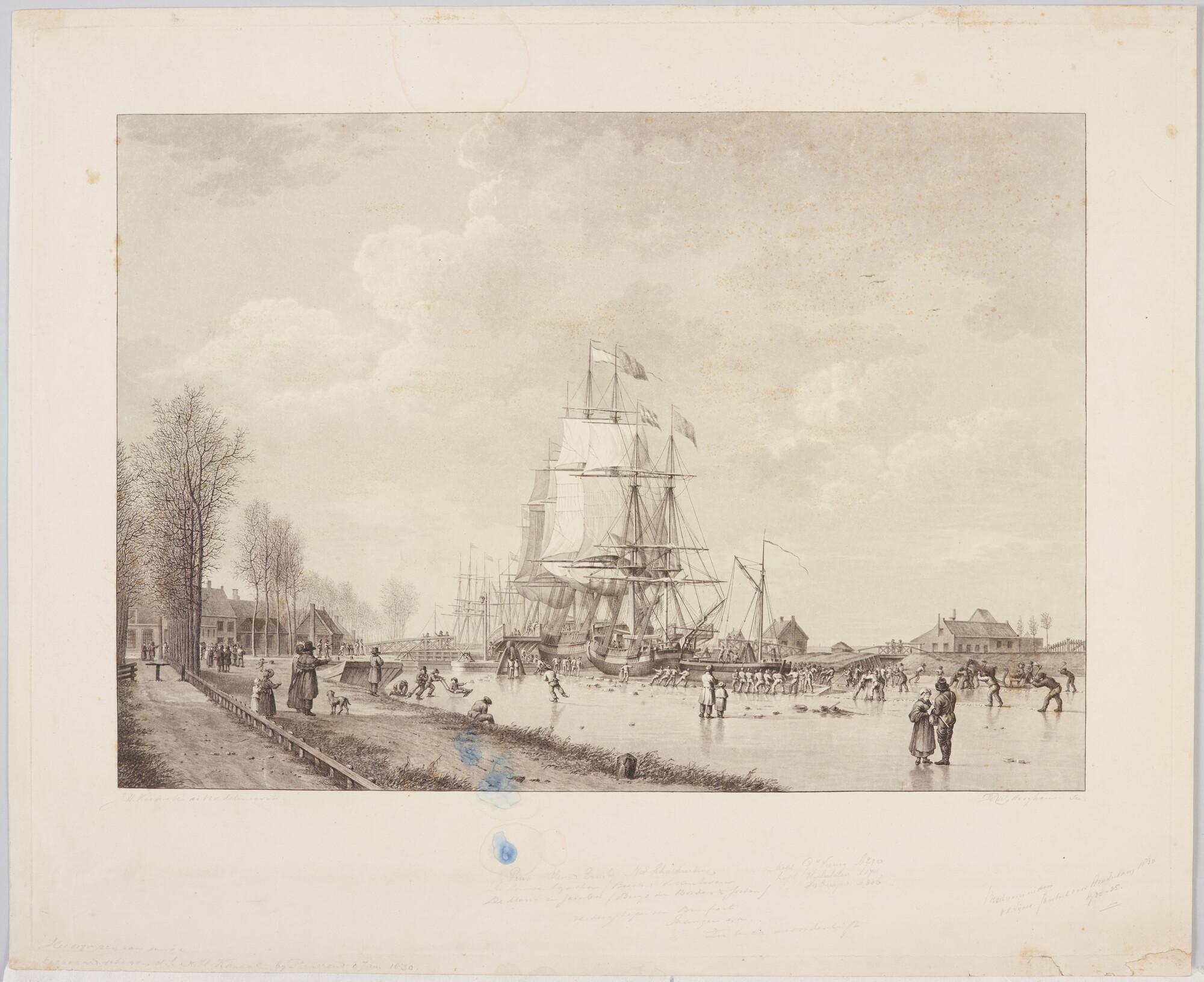 Proefdruk van de prent "Voorstelling der Door-IJzing van eenige Koopvaardij-Schepen, door het Groot Noord-Hollandsch Kanaal, nabij Purmerende op den 9 Januarij 1830"