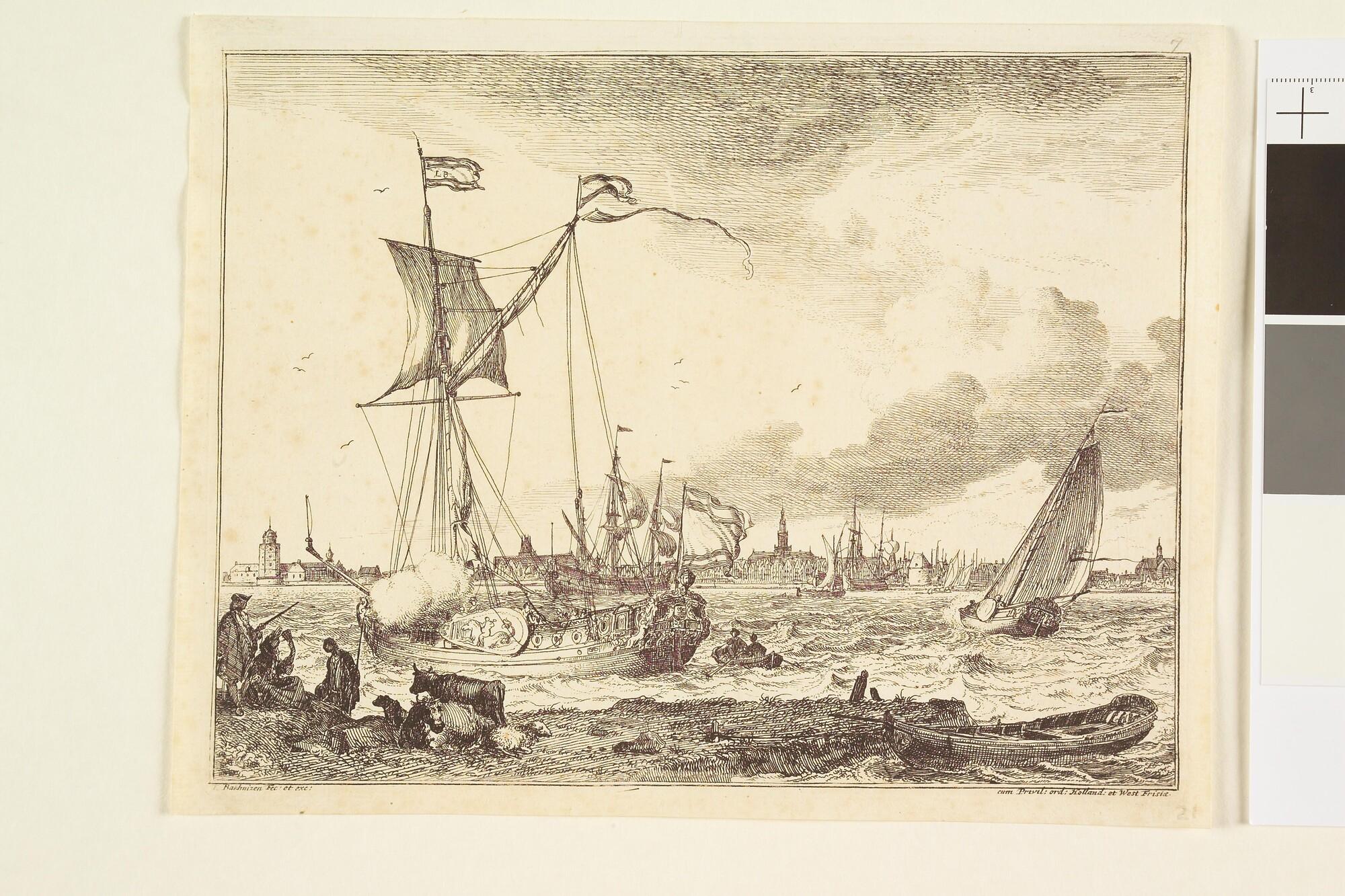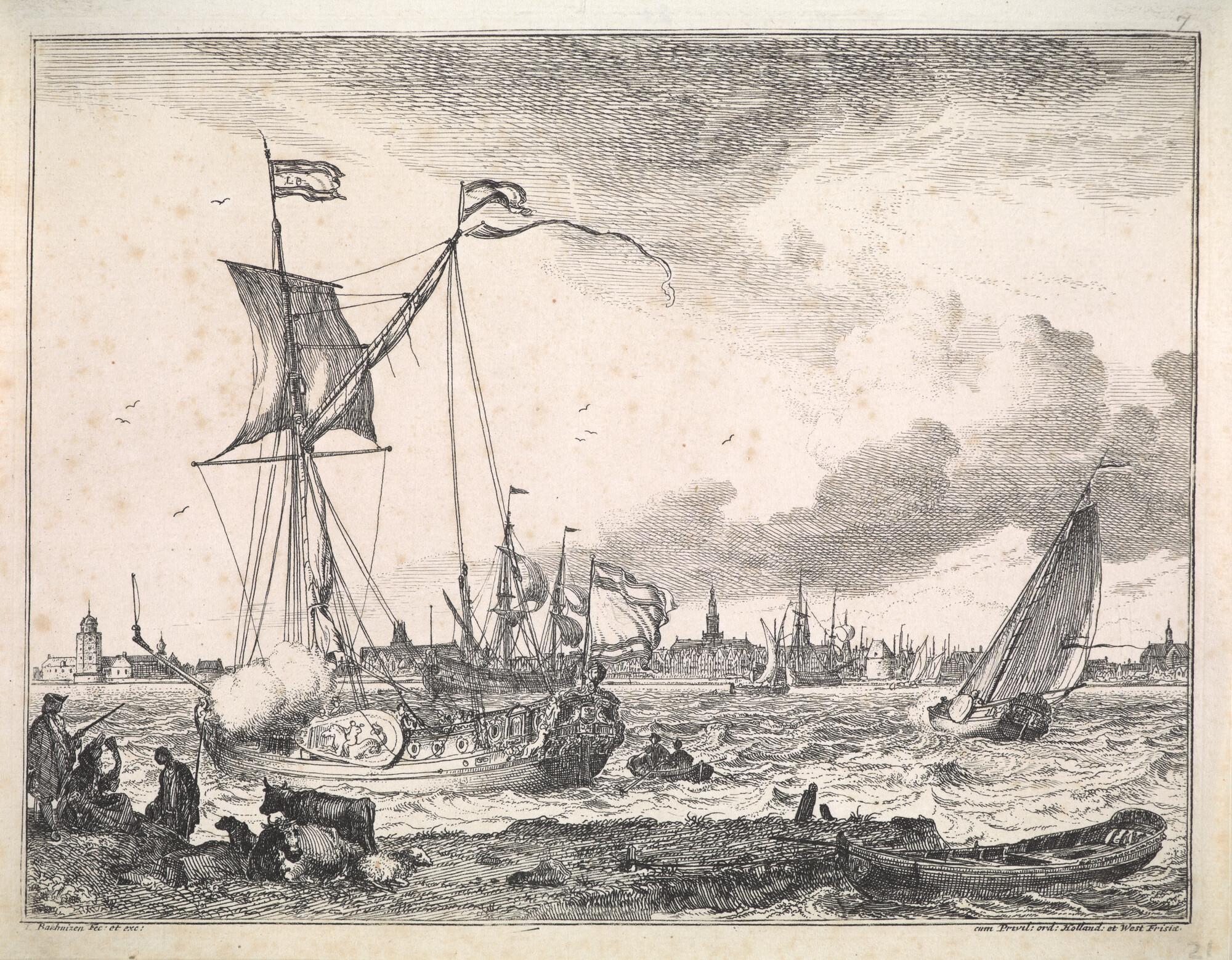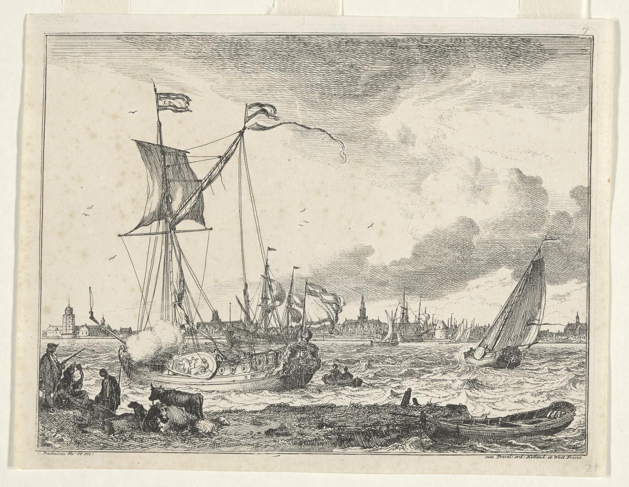 Uit de serie D'Y Stroom en Zeegezichten: Een spiegeljacht van de Staten-Generaal en een boeier die zeil mindert. Op de achtergrond een stad.