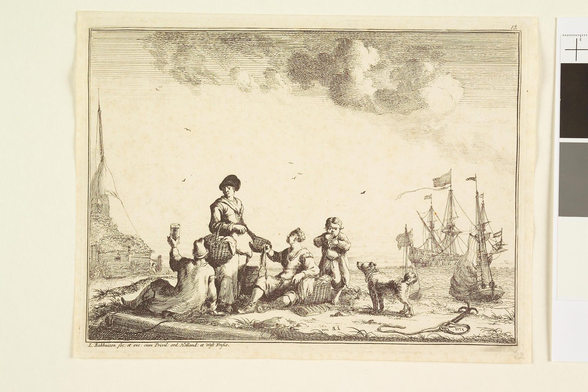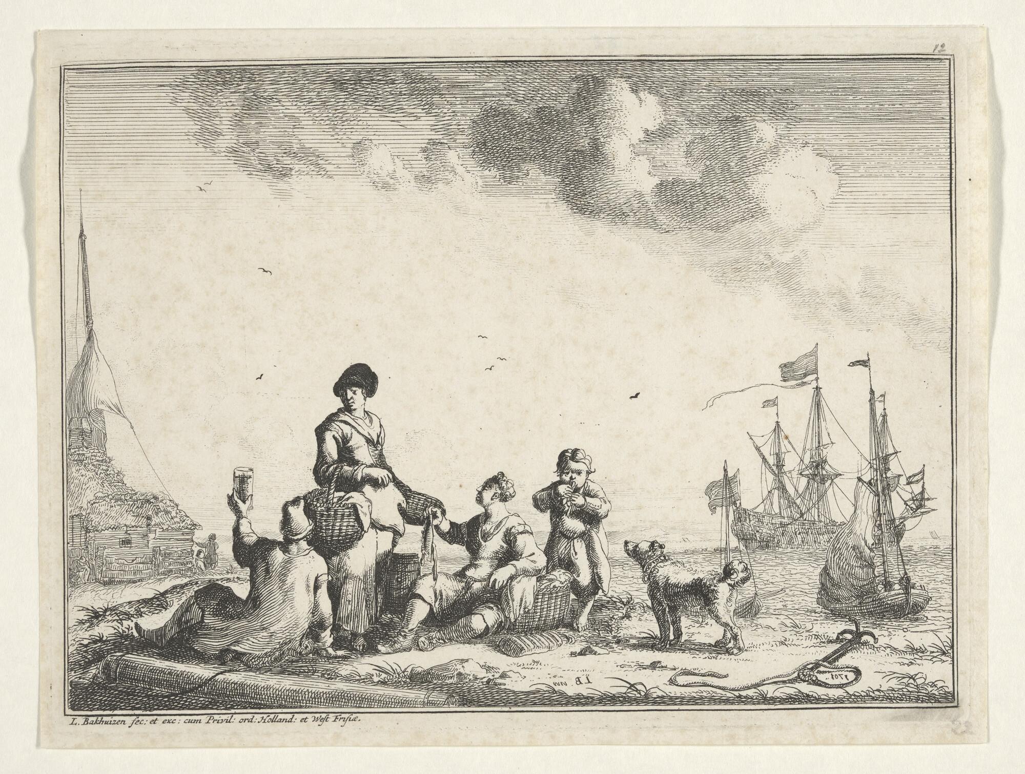 Uit de serie D'Y Stroom en Zeegezichten: Gezelschap op het strand, waaronder een visverkoopster.