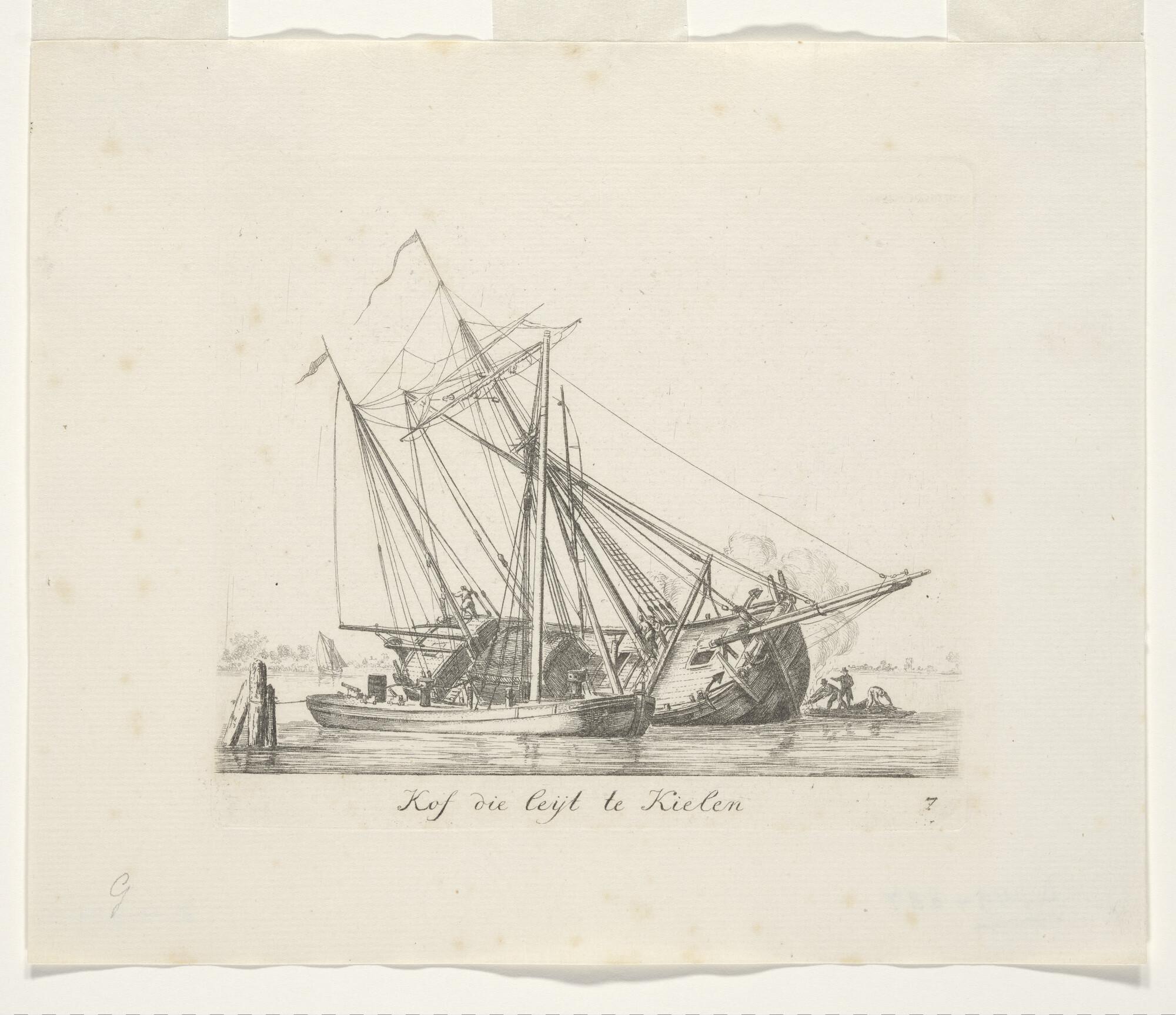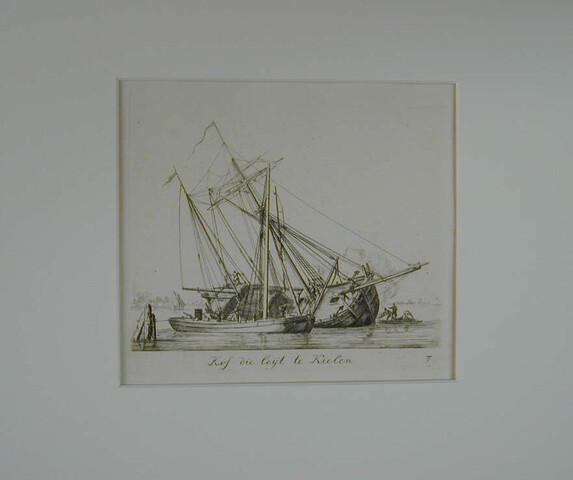 Prent van het kielen van een kofschip. Uit de suite 'Verscheide Soorten van Schepen en Vaartuijgen', nummer 7.