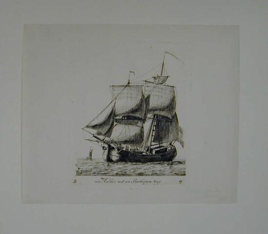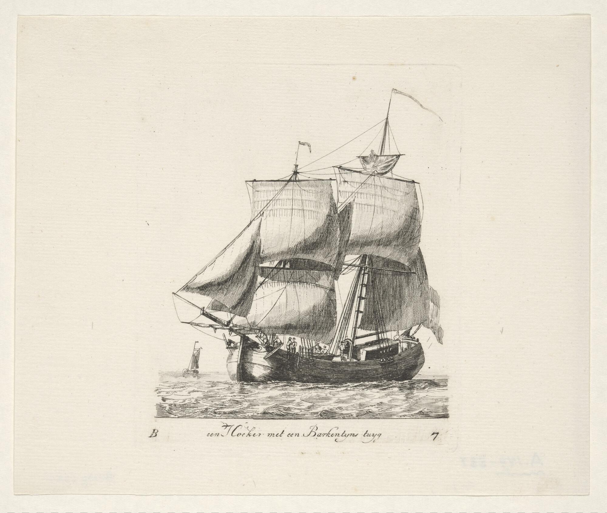 Prent van een hoeker met barketijnstuig. Uit de suite "Verscheide soorten van Hollandse vaartuigen", 2de katern, B-7.