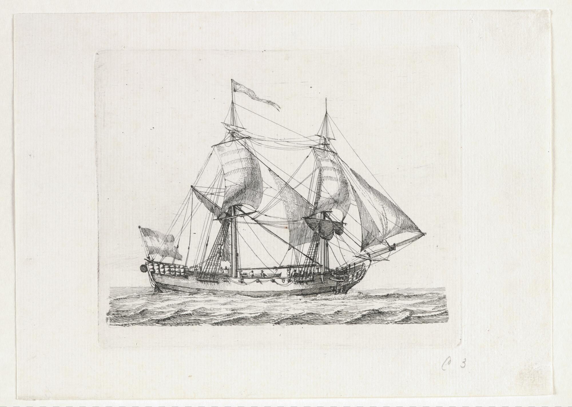 Prent van een snauwschip voor de wind zeilend. Uit de suite "Verscheide soorten van Hollandse vaartuigen", 3de katern.