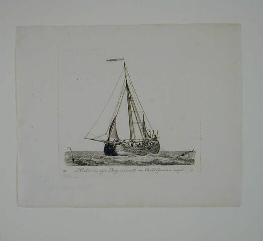 Prent van een hoeker die zijn beug inzeilt. Uit de suite 'Verscheide soorten van Hollandse schepen', vierde katern, D-9.