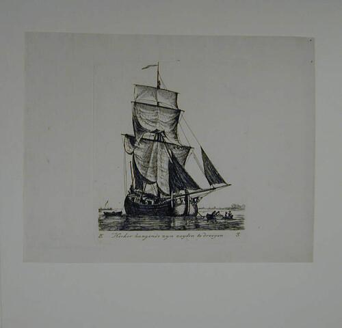 Prent van een hoeker, waarvan de zeilen te drogen hangen. Uit de suite 'Verscheide soorten van Hollandse schepen', vijfde katern, E-3.