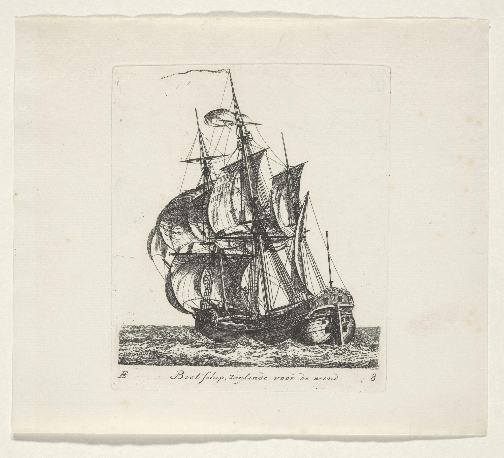 Prent van een bootschip. Uit de suite 'Verscheide soorten van Hollandse schepen', vijfde katern, E-8.