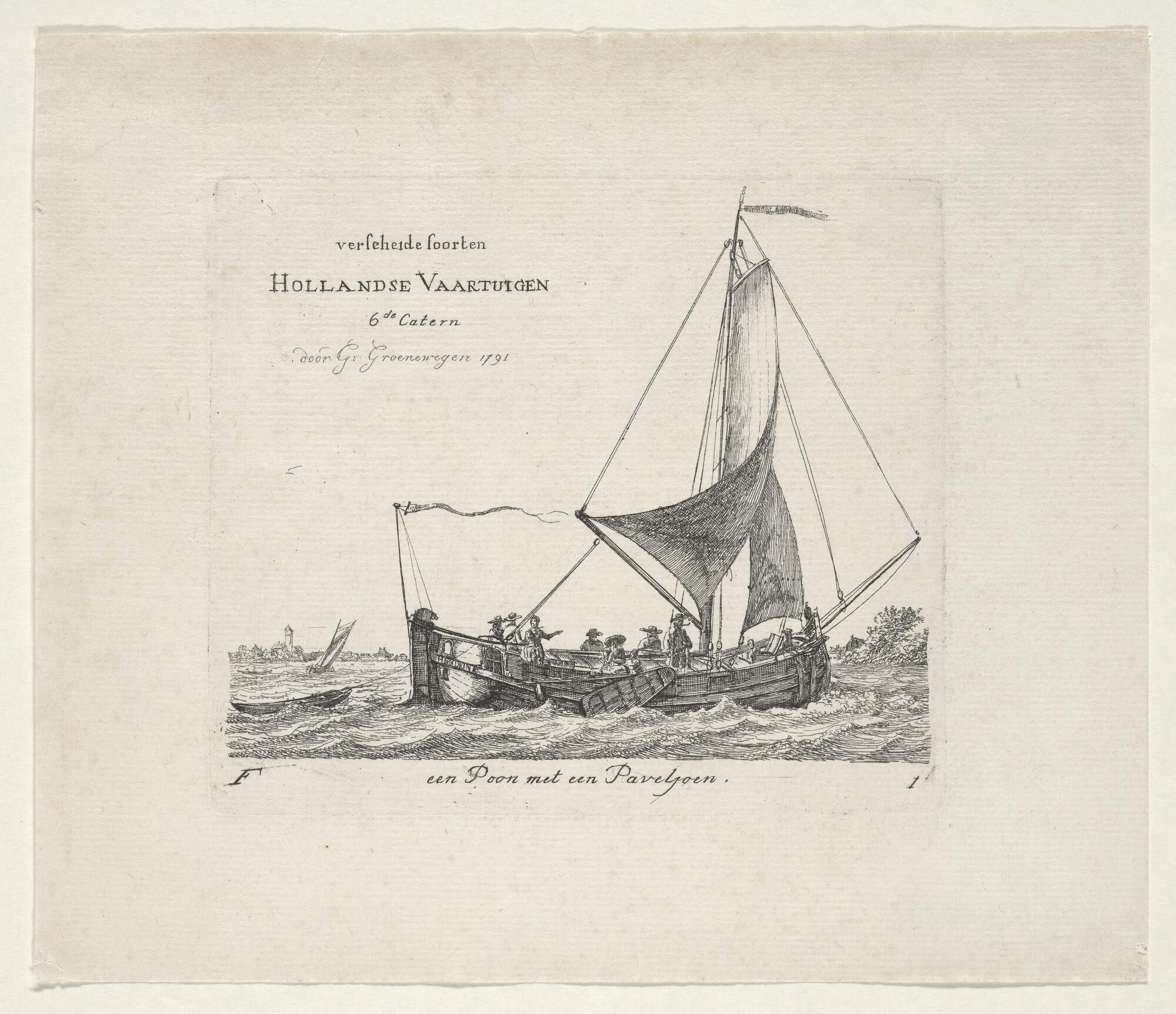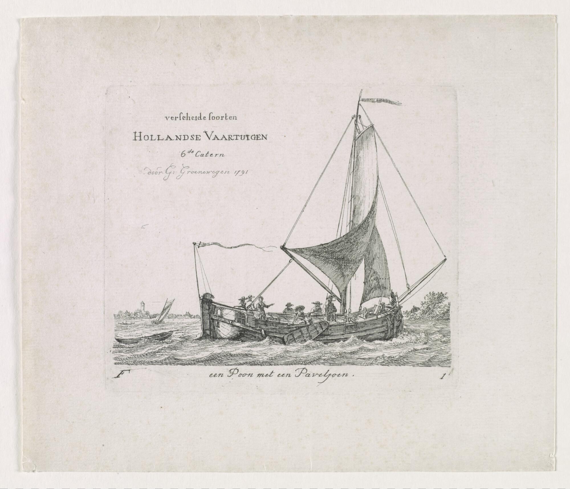 Prent van een paviljoenpoon. Uit de suite 'Verscheide soorten van Hollandse schepen', zesde katern, F-1 (titelblad).