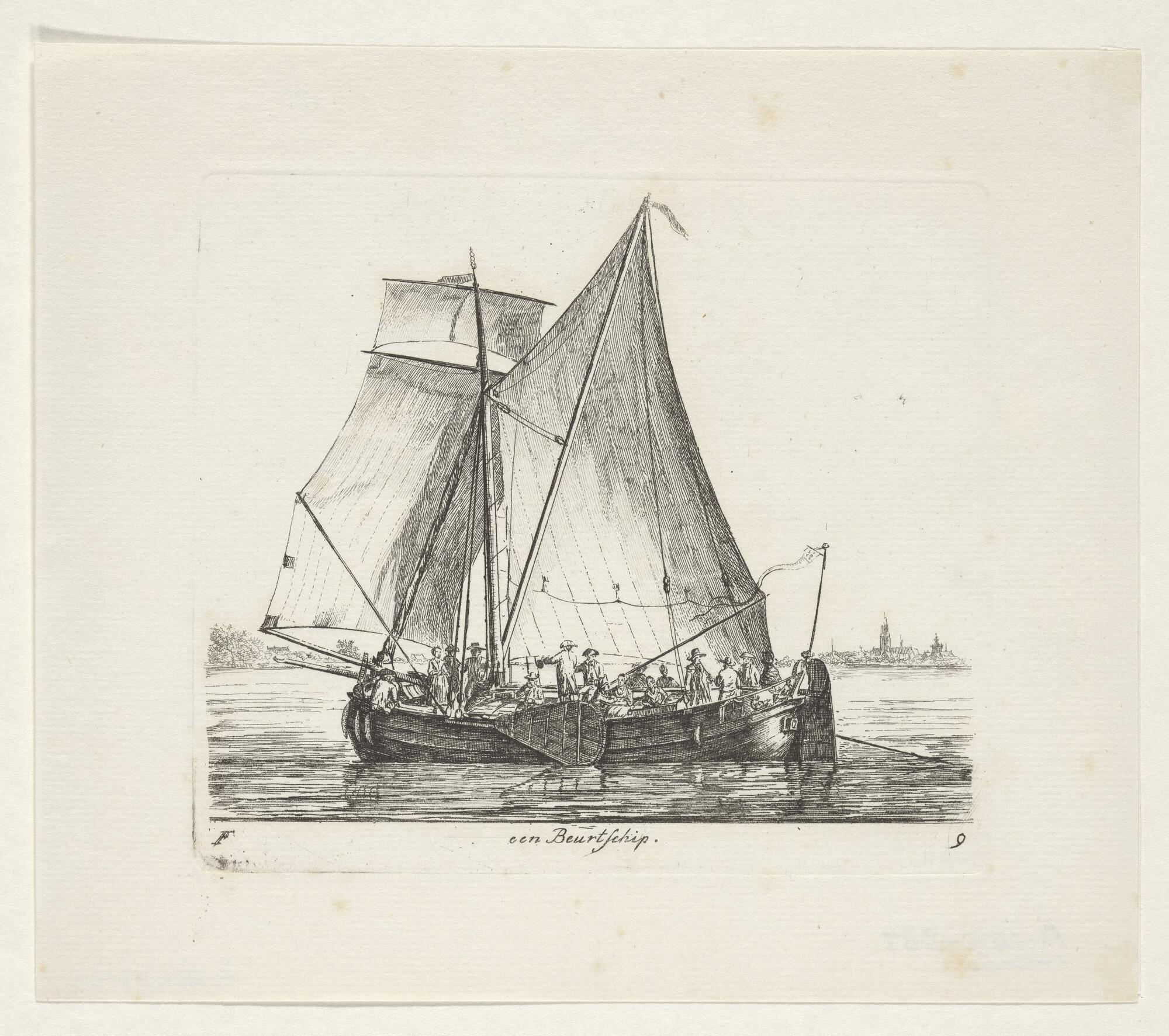 Prent van een beurtschip met passagiers. Uit de suite 'Verscheide soorten van Hollandse schepen', zesde katern, F-9.