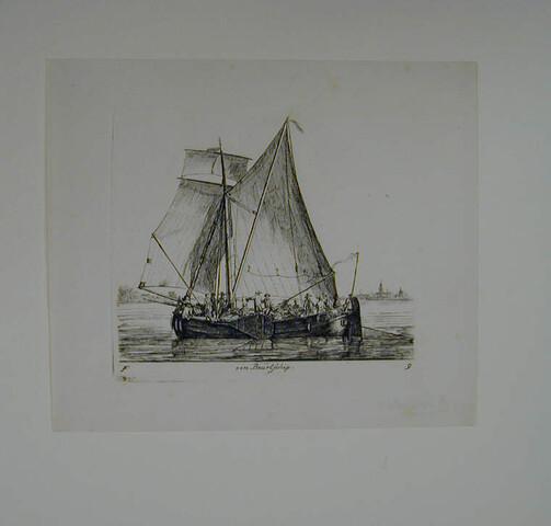 Prent van een beurtschip met passagiers
