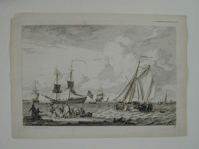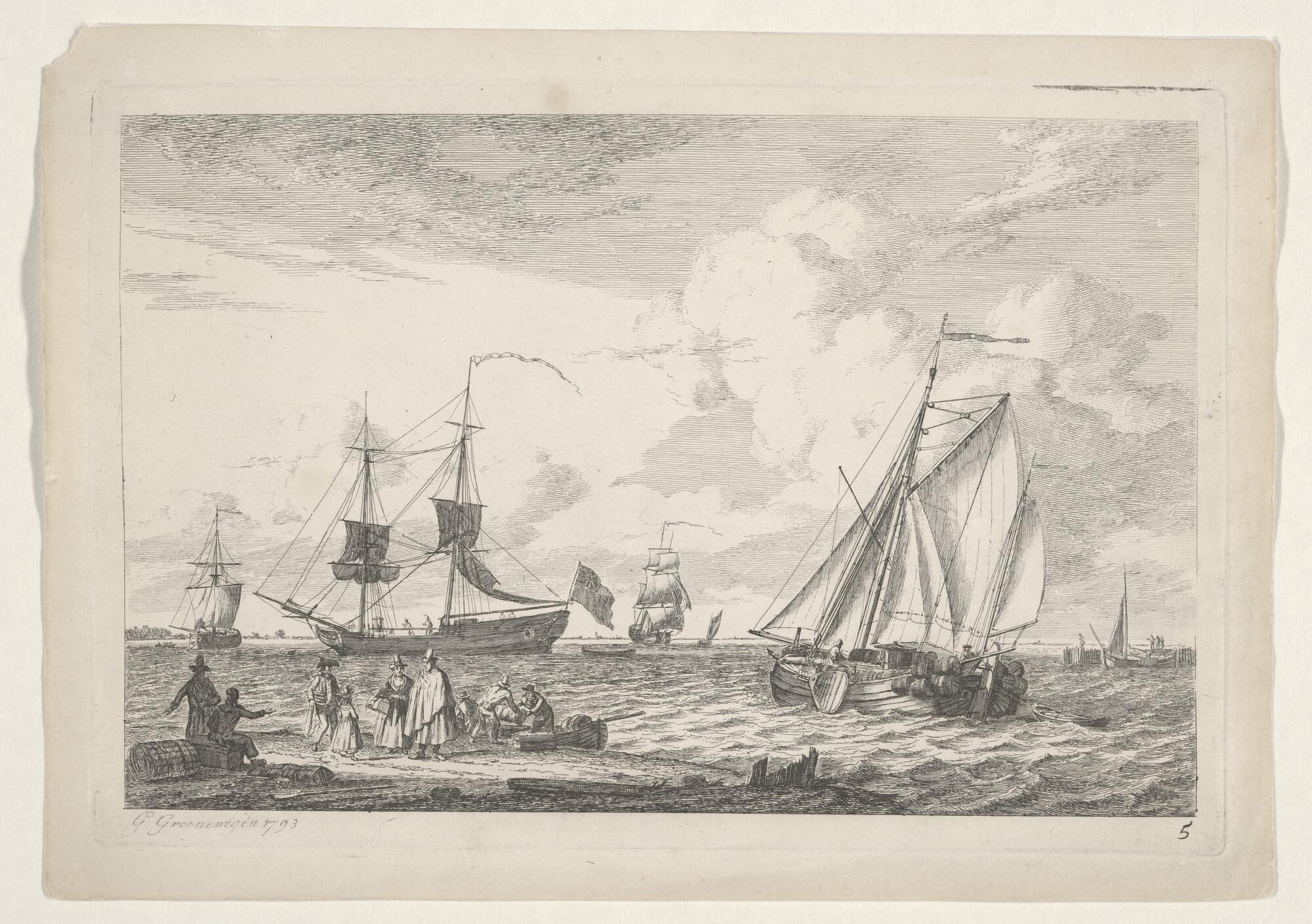 Schepen in een riviermonding, op de voorgrond reizigers. Links een Engels brikschip, rechts een smakschip (of bom?).
