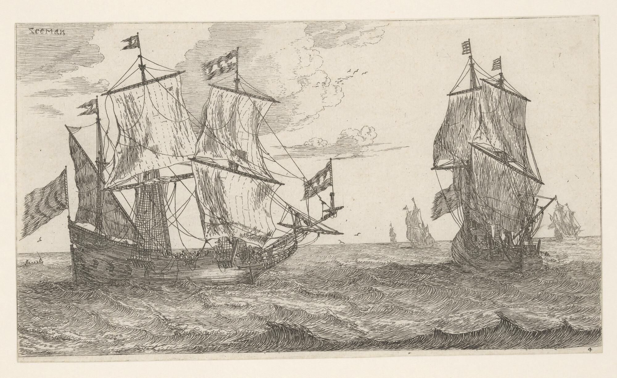 Prent van twee fluitschepen in open water