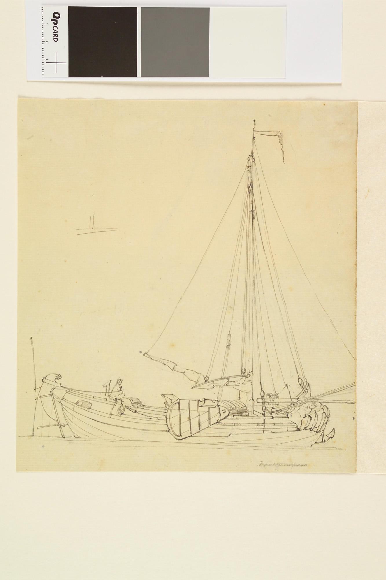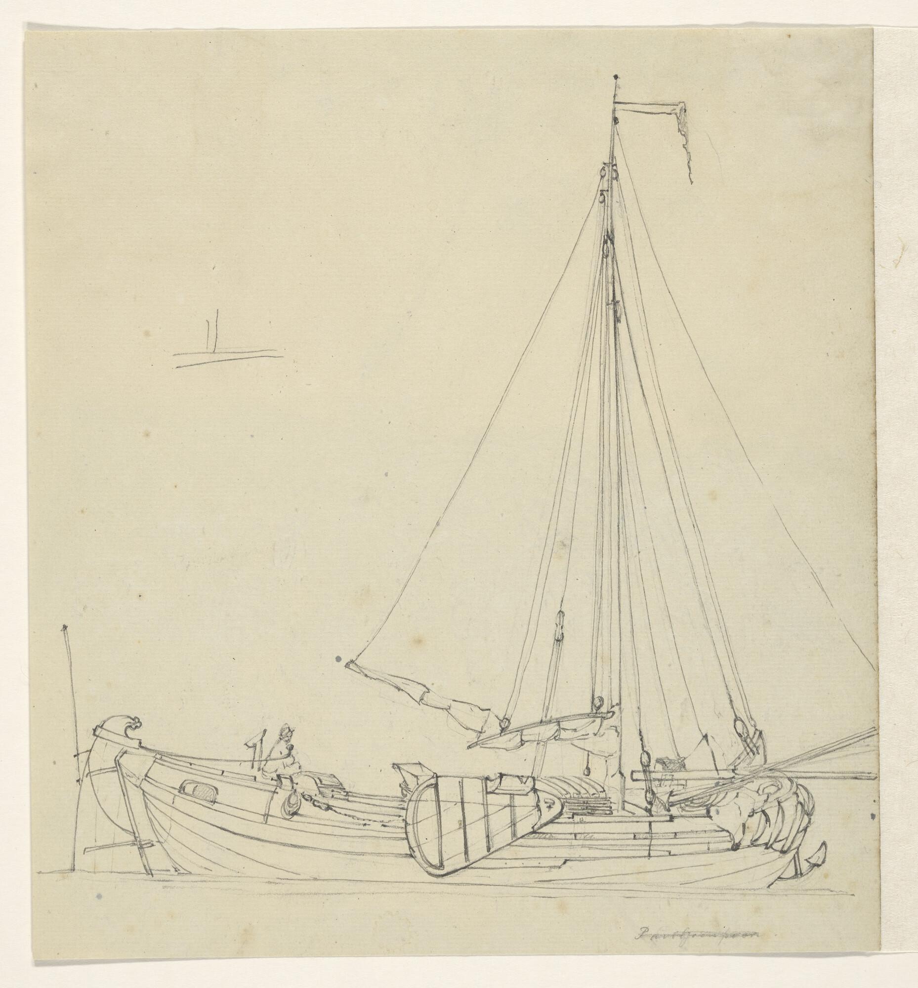 Een binnenschip. [Verso: twee paarden aan een ruif, een baken en een binnenschip.].
