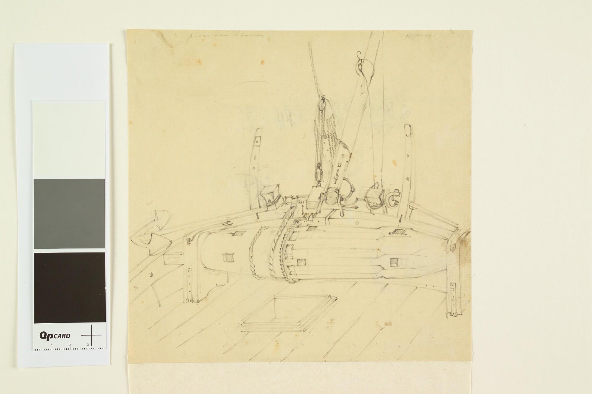 Het voorschip van een poon van binnen met de mastrol. [Verso: studies van daken van huizen en twee vrachtscheepjes.].