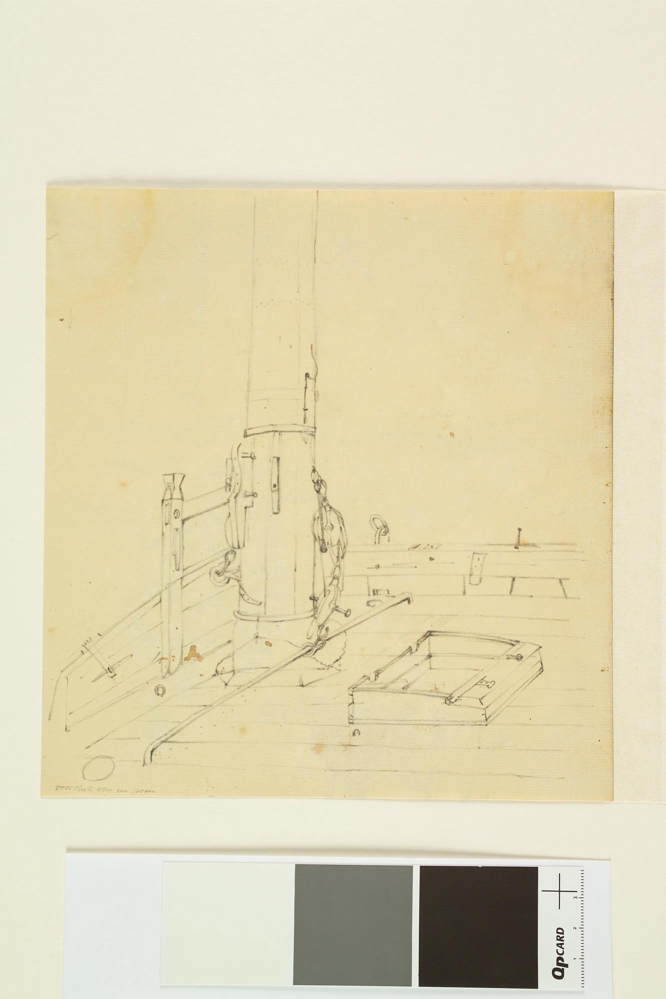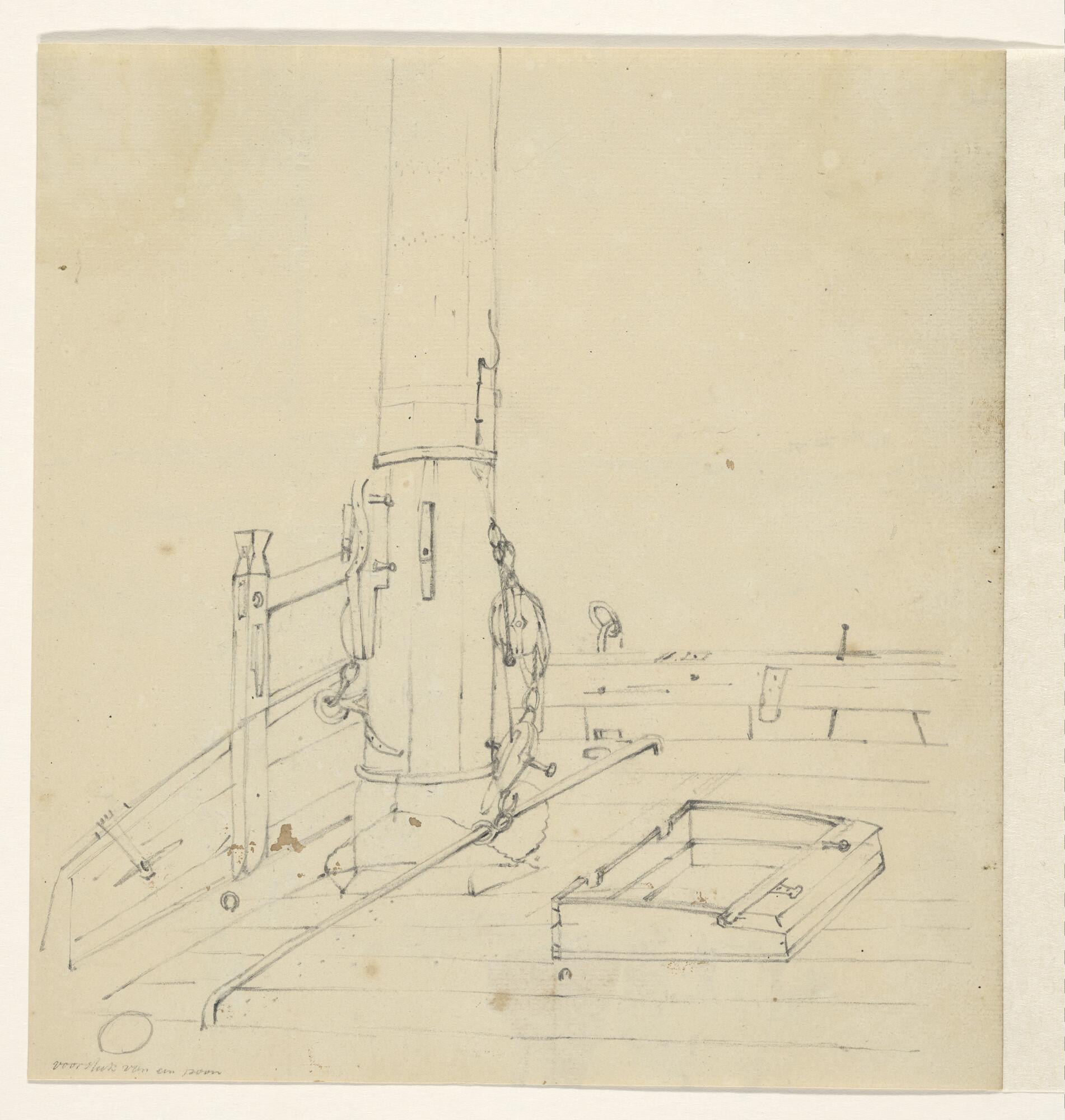 Onderkant mast en dek van een poon. [Verso: twee visserslieden en een vrouwtje en andere.].