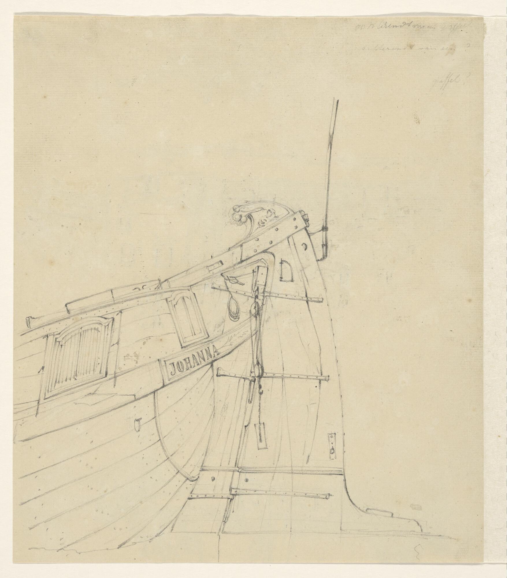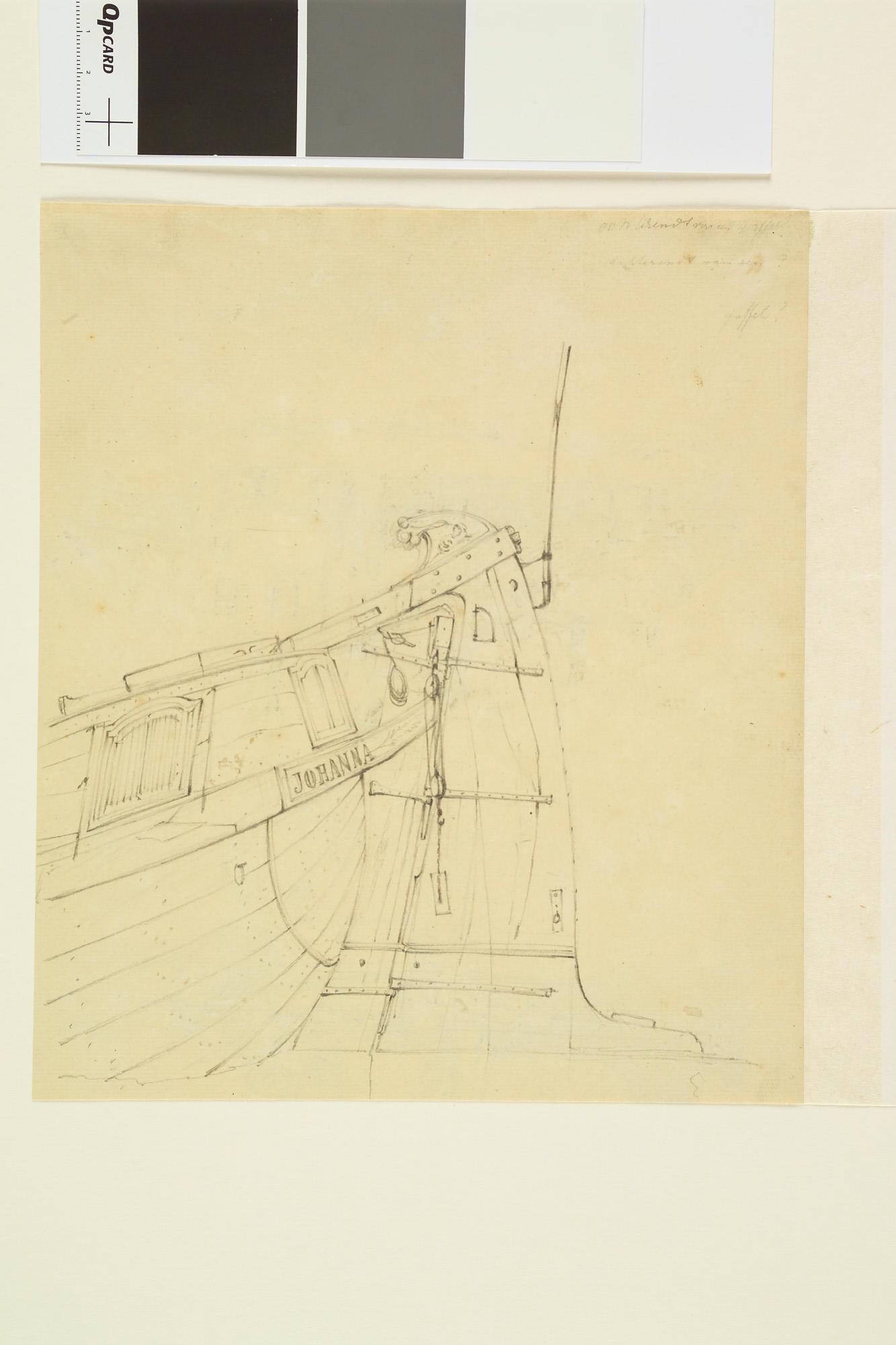 Het achterschip van een gaffelschip [?] "Johanna...". Verso: twee roeibootjes en een groep huizen.