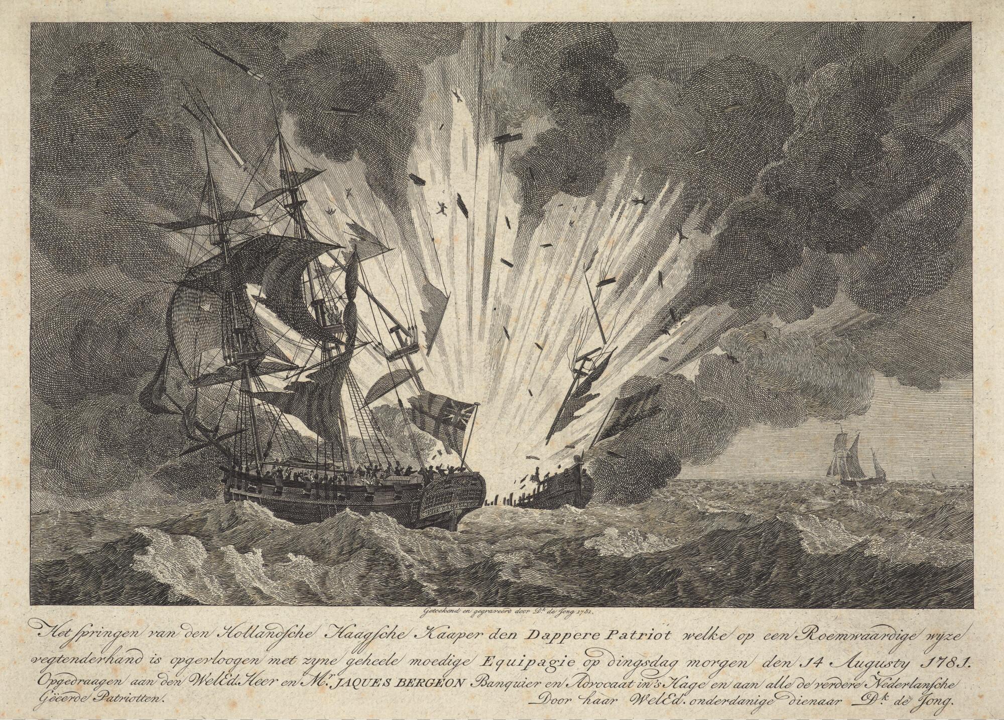 Het in de lucht vliegen van de Haagse kaper Den Dappere Patriot op 14 augustus 1781.