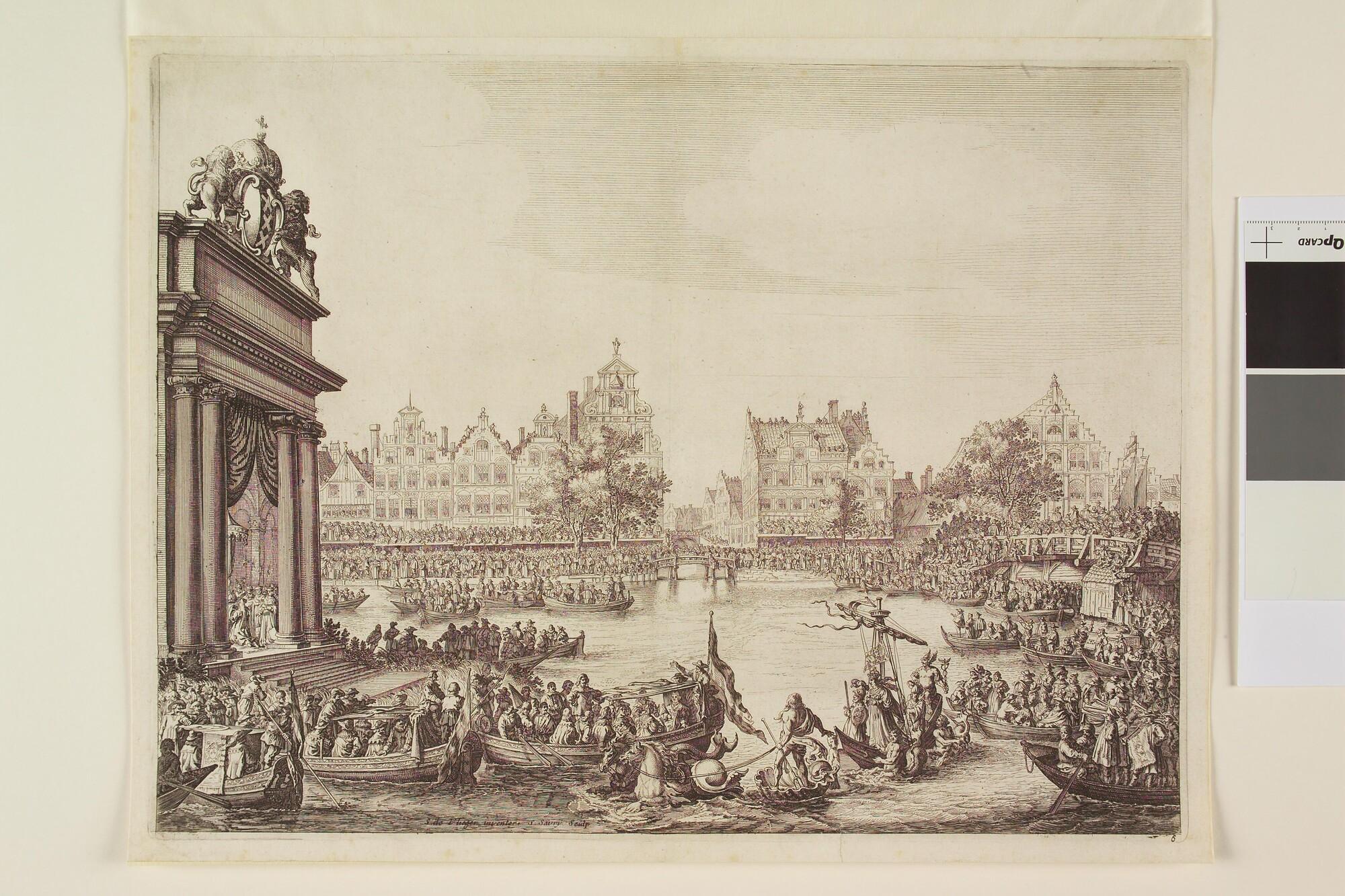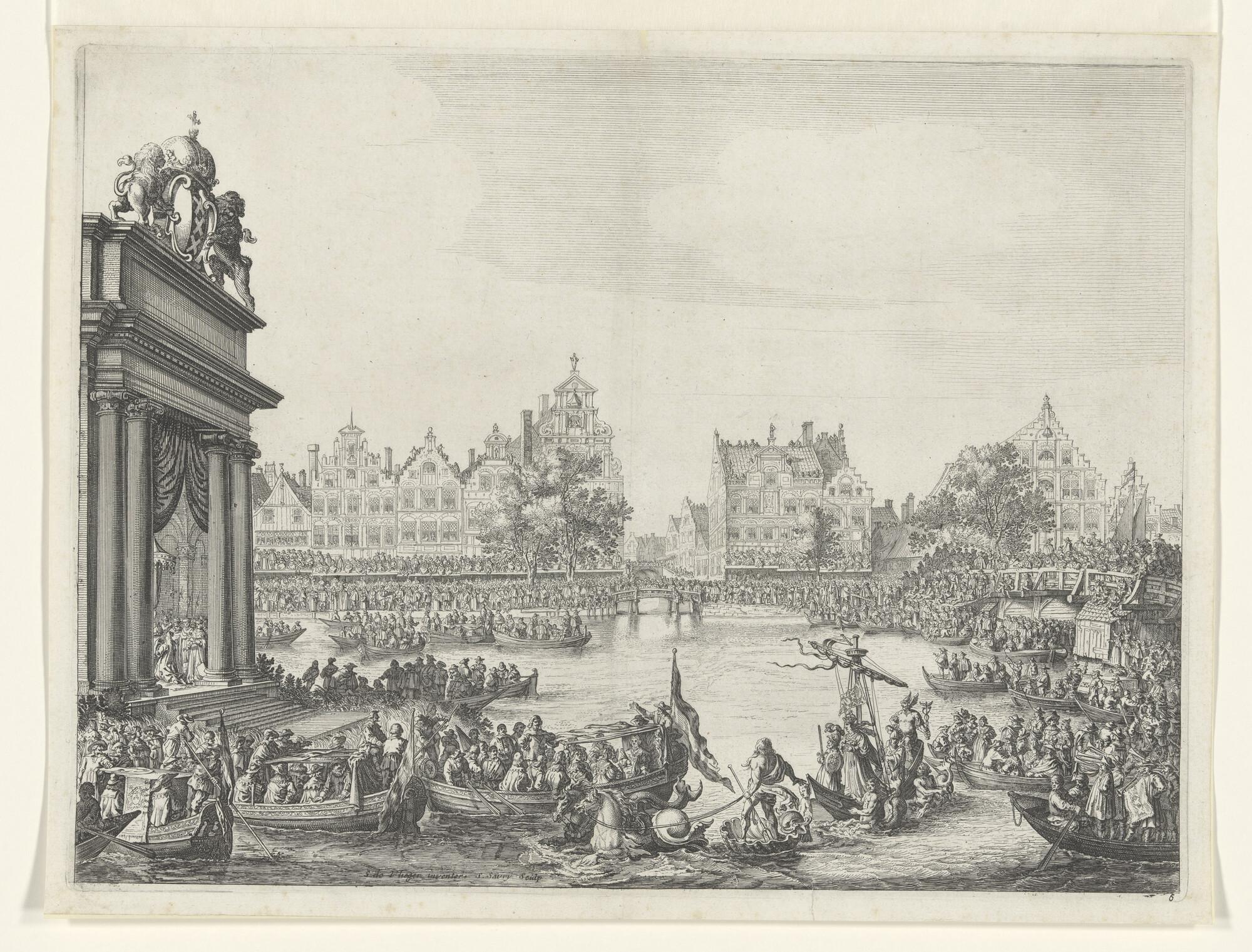 De tocht over de Amstel te Amsterdam van Maria de Medici in 1638. Links de triomfboog opgericht op een eilandje in de Amstel.; illustratie uit C. Barlaeus,Medicea Hospes Amsterdam 1638).