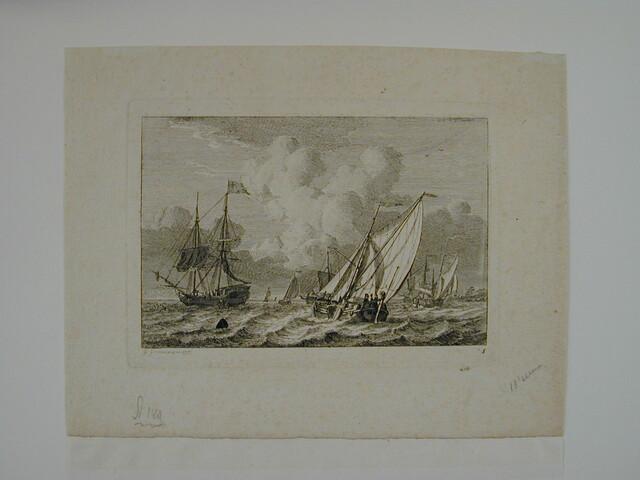 Riviergezicht, met op de voorgrond een binnenvaartuig met spriettuig, op de achtergrond rechts een statenjacht, links een Engelse schoener.