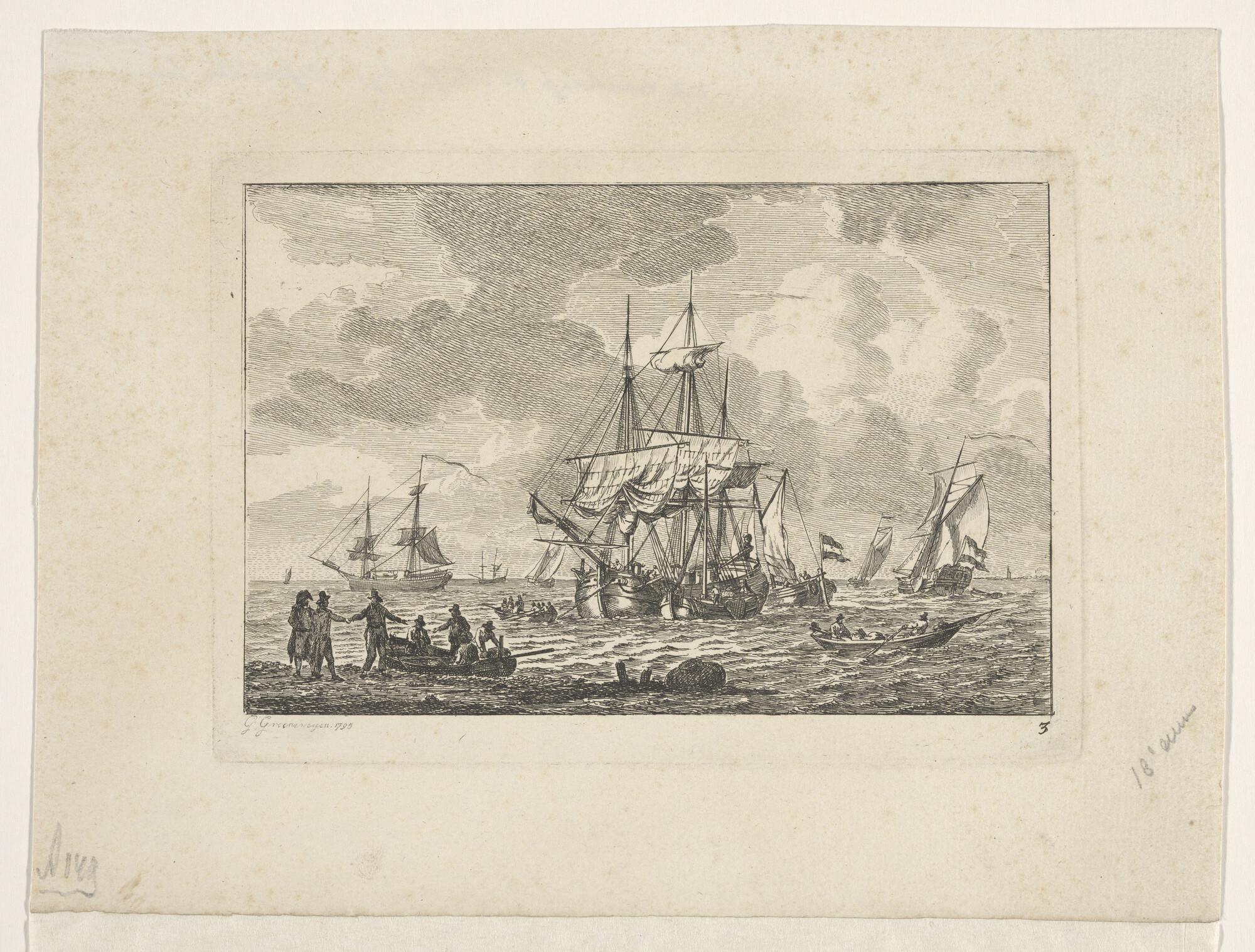 Zeegezicht, op den voorgrond een driemasthoeker, op de achtergrond rechts een